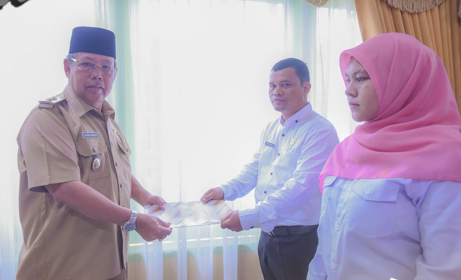PENJURU.ID | PADANGSIDIMPUAN-Wakil Walikota Padangsidimpuan Ir. Arwin siregar, MM menyerahkan secara langsung SK Pegawai Pemerintah dengan Perjanjian Kerja (PPPK), dalam hal ini Tenaga Pendidik/guru Formasi Tahun 2022, di lingkungan Pemerintah Kota Padangsidimpuan, Senin (12/6).