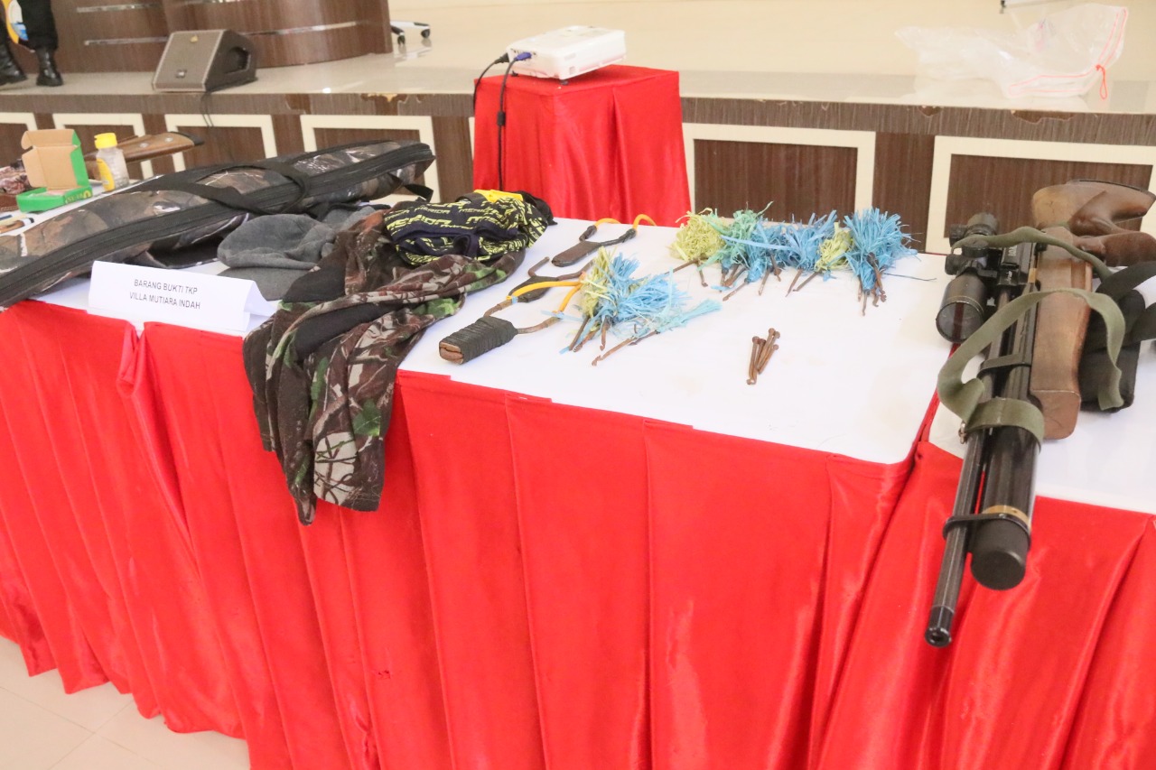 Adapun barang bukti yang diamnkan diantaranya rangkaian bom, senpi laras panjang jenis pcp 6 pucuk, senjata tajam parang, badik, pedang, samurai, busur, buku buku yg bersifat provokatif radikal, dll yang tergelar dalam release. (Syd)