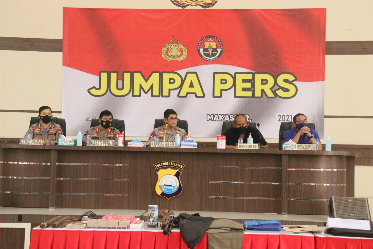 Didampingi Pejabat Densus 88 Mabes Polri, Kabag Penum Div Humas Mabes Polri dan Kabid Humas Polda Sulsel, Kapolda Sulsel menjelaskan penindakan Densus 88 AT Polri terhadap jaringan kelompok teroris di perumahan Villa Mutiara Biru, Kota Makassar yang terjadi Rabu, (06/01/2021) sekitar pukul 06.00 Wita.