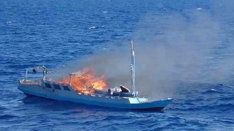 Pasukan Perbatasan Australia (ABF) merilis serangkaian foto yang menunjukkan perahu kecil berwarna-warni terbakar di permukaan laut setelah patroli tiga hari di dekat Rowley Shoals Marine Park, lepas pantai utara Australia Barat.