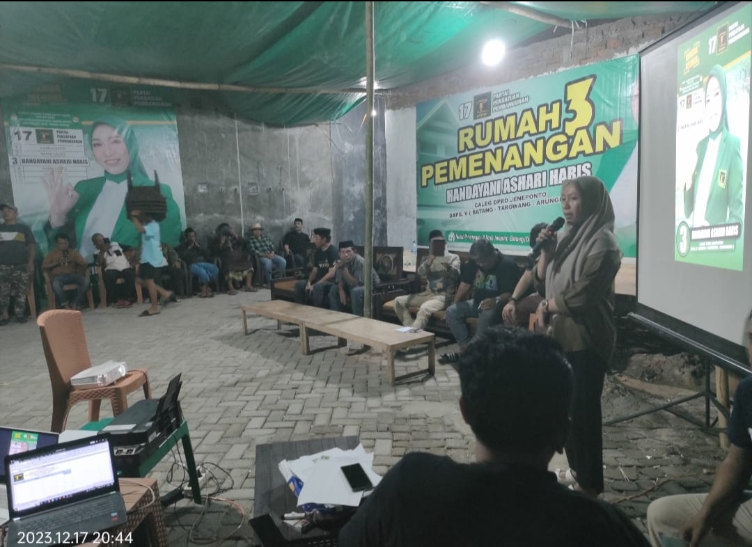Ratusan tim dan para simpatisannya berdatangan dirumah (Posko) pemenangan Handayani Ashari Haris yang berlokasi di depan pasar tradisional Tarowang Jln. poros Jeneponto Bantaeng tepatnya di Dusun Tanggakan, Desa Tarowang, Minggu (17/12/2023) mulai pukul 20.00 Wita, berakhir pukul 23.00 Wita.