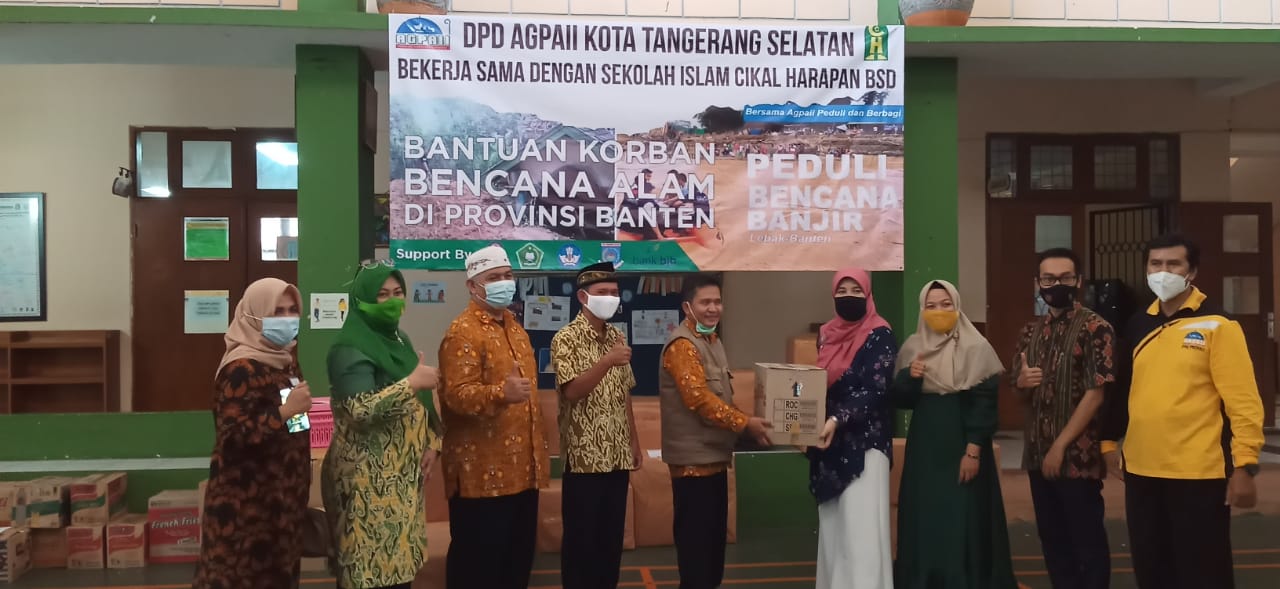 PENJURU.ID | Tangsel – Asosiasi Guru Pendidikan Agama Islam Indonesia (AGPAII) Kota Tangsel menyerahkan bantuan untuk korban banjir Lebak, Banten. Penyerahan bantuan secara simbolik dilaksanakan di Yayasan Permatasari Cikap Harapan BSD, Serpong, Tangerang Selatan. Senin (14/12/2020).