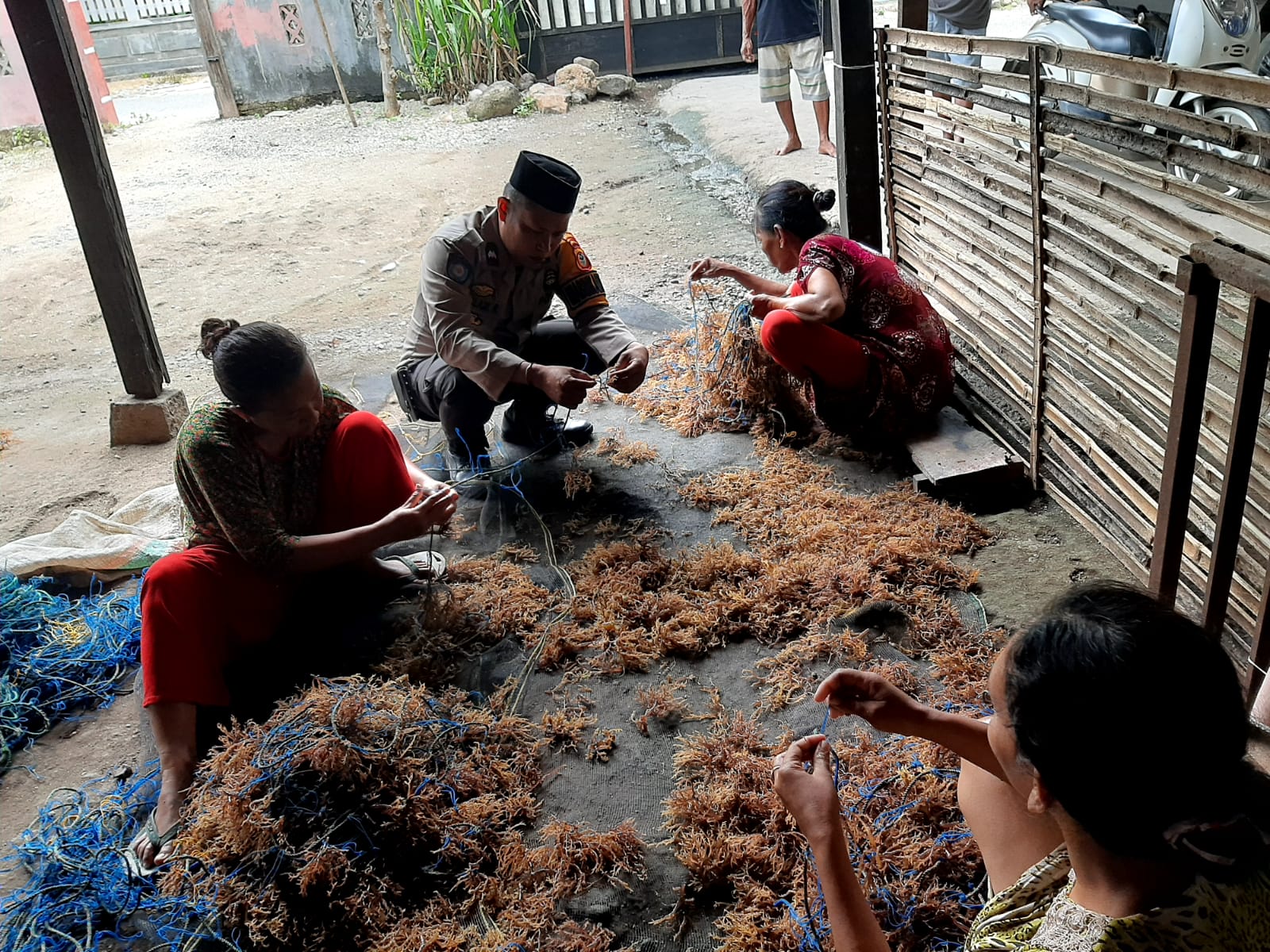 PENJURU.ID | Jeneponto – Aipda Syamsu Alam Bhabinkamtibmas Desa Pao Polsek Batang yang tampak sedang membantu warga menamen dan mensortir rumput laut, Senin (23/01/2023)