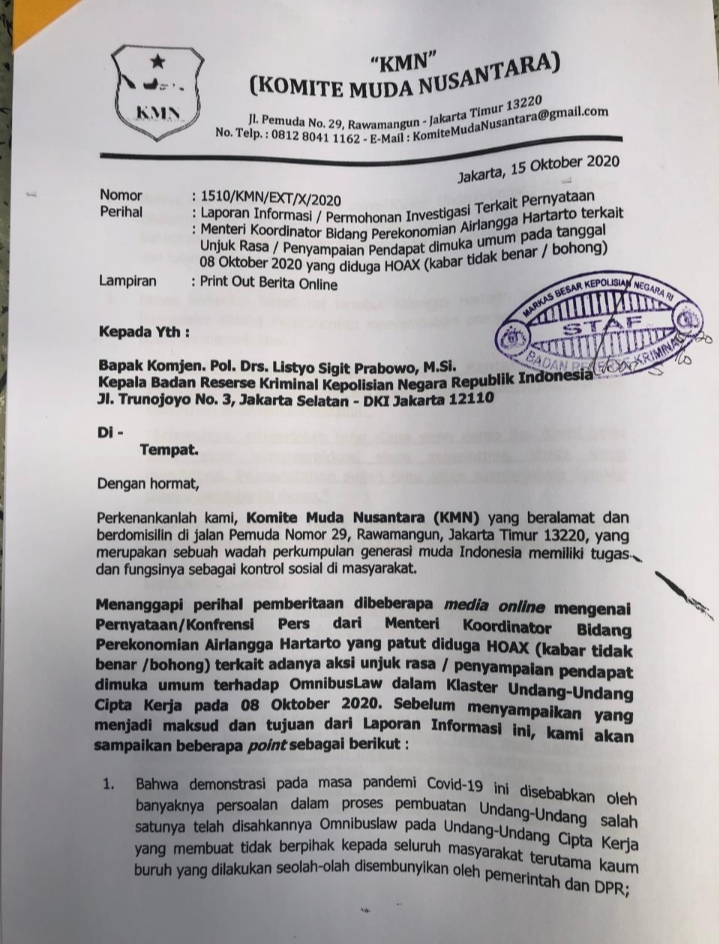Karena itu, Komite Muda Nusantara (KMN) melaporkan Airangga Hartarto ke Bareskrim Mabes Polri, Kamis (15/10/2020).