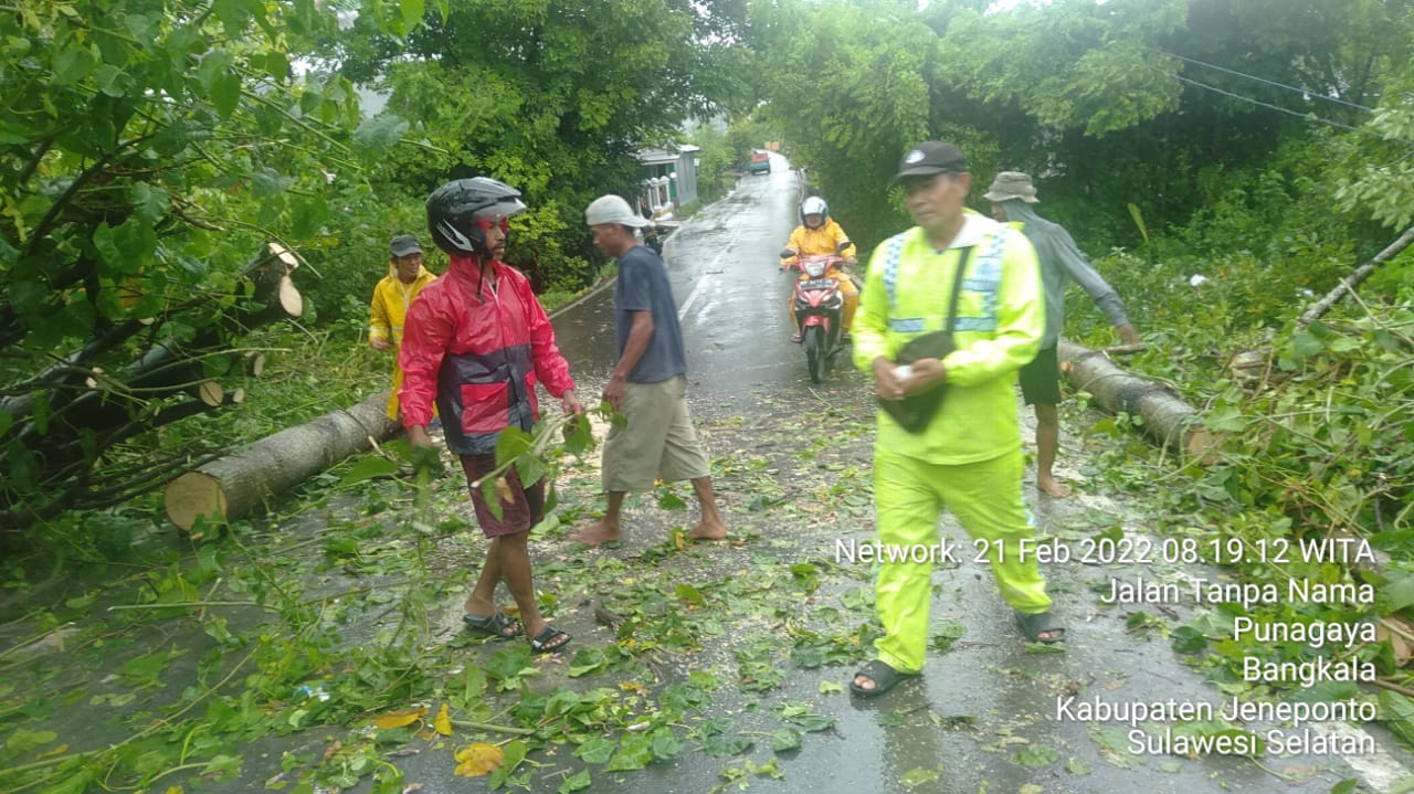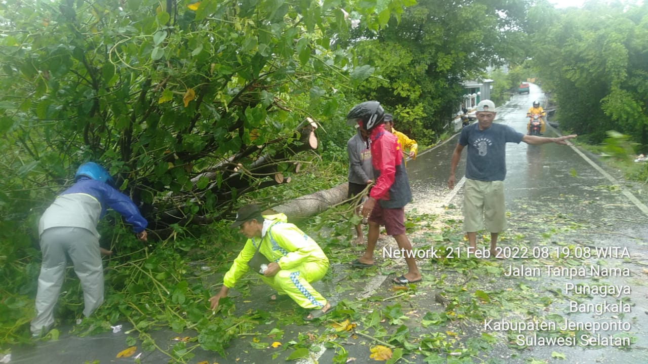 PENJURU. ID | Jeneponto – Bhabinkamtibmas Aiptu Dri Satoto Hartono membersihan batang pohon tumbang akibat angin kencang yang menghalangi akses jalan desa menuju PLN persero dan PLTU bosowa.