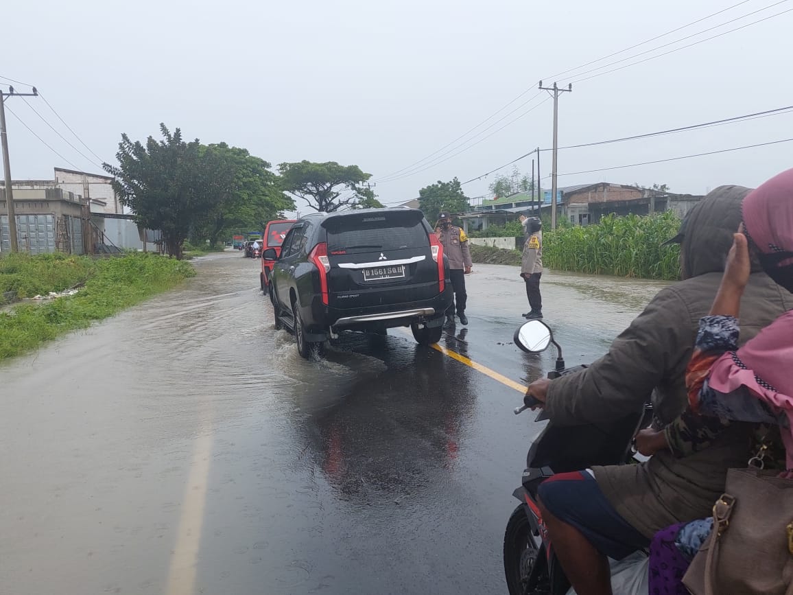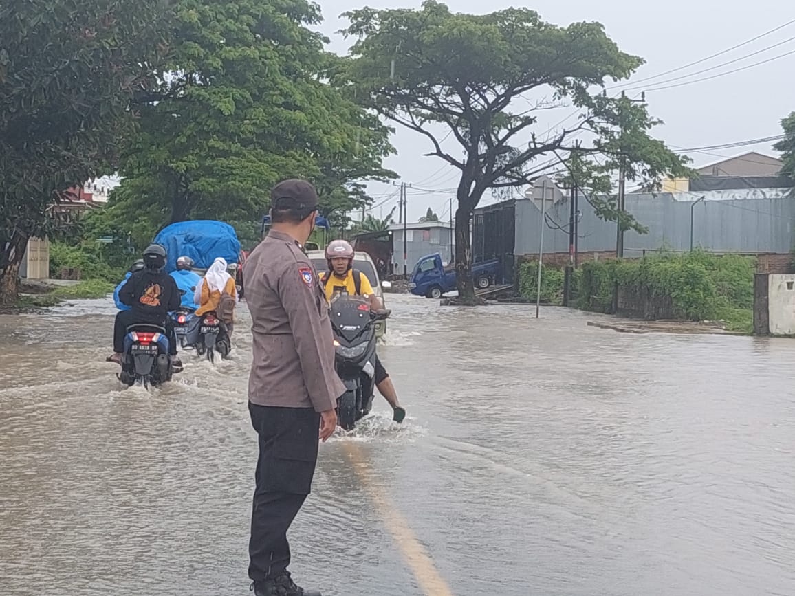 Personil Polsek Bangkala hadir di tengah-tengah masyarakat dalam bentuk pelayanan datangi TKP turun ke jalan dalam rangka pengaturan arus lalulintas yang melambat akibat jalanan tergenang air setinggi 30 cm.