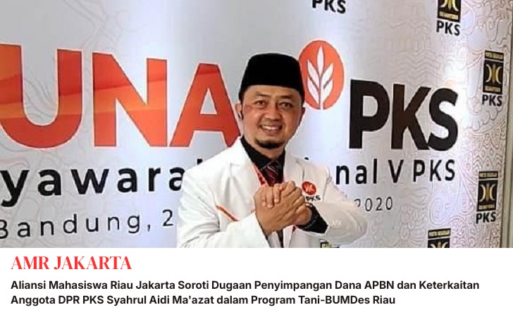 Penjuru.id | Jakarta — Ketua Umum Aliansi Mahasiswa Riau Jakarta (AMR Jakarta), Rahmat Pratama, menyoroti secara serius sejumlah dugaan penyimpangan dalam pelaksanaan program Anggaran Pendapatan dan Belanja Negara (APBN) di Provinsi Riau, yang mencakup dugaan pemotongan dana bantuan, dugaan bantuan tidak tepat sasaran, serta dugaan keterlibatan pihak perantara yang dalam isu publik disebut-sebut memiliki relasi dengan Anggota DPR RI dari Partai Keadilan Sejahtera (PKS), Syahrul Aidi Ma’azat.