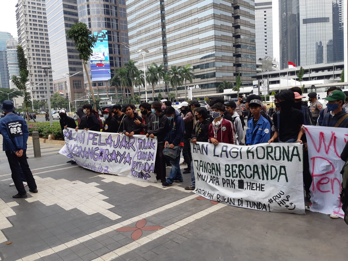 “Tolong kepada DPR tolong batalkan Omnibus Law karena dampaknya bukan hanya ke buruh tapi juga berdampak kepada kami sebagai pelajar, coba bayangkan bila istri bapak atau ibu bahkan sedang hamil lalu dipaksa bekerja apakah tidak tersiksa? jadi tolong kepada DPR agar membatalkan Omnibus Law,” ungkap salah satu pelajar yang ikut berdemo di depan gedung Kementerian Pendidikan dan Kebudayaan.