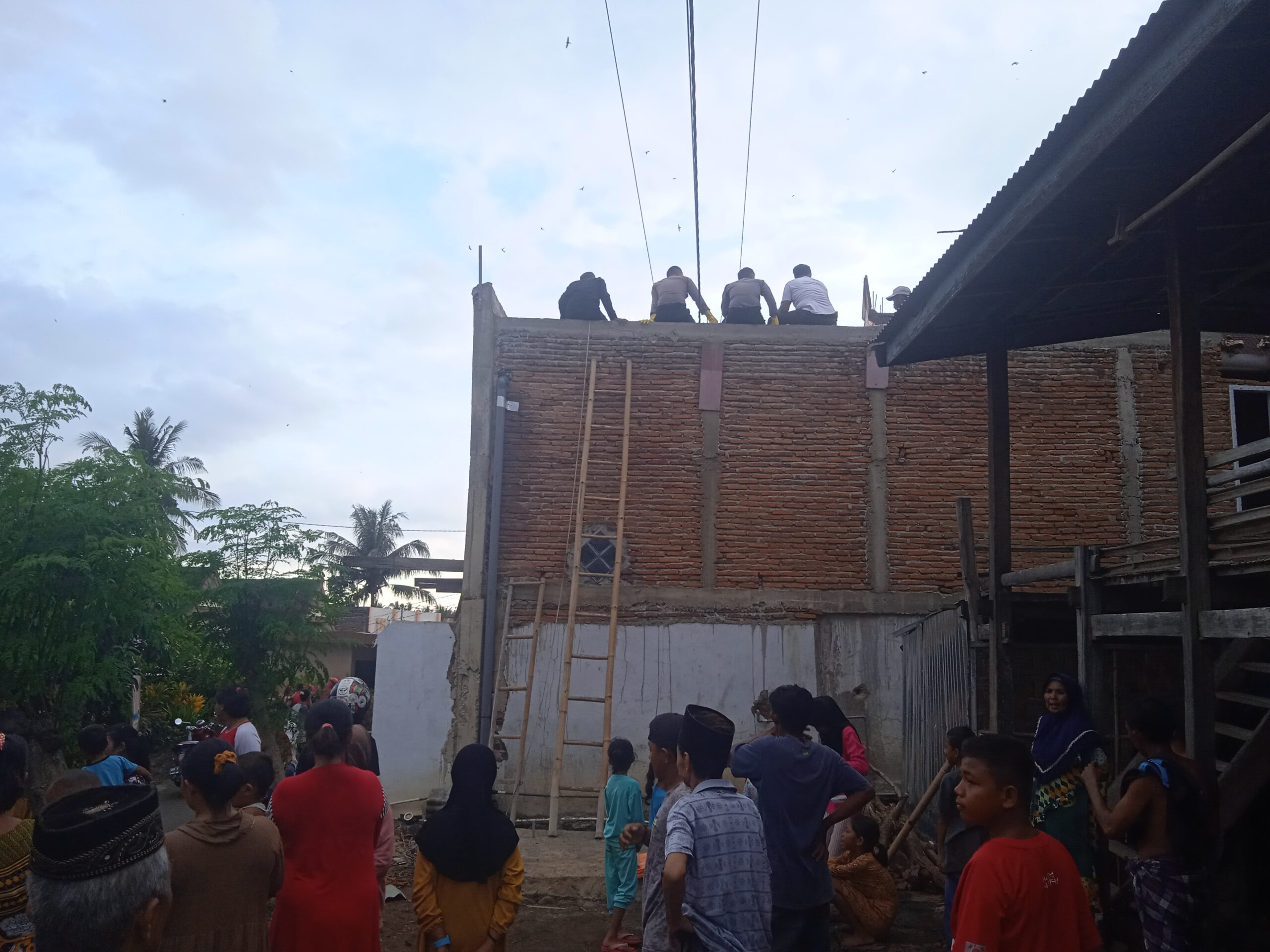 “Biasanya menggunakan tali untuk menarik selang air namun tadi korban tiba-tiba menggunakan besi behel dipake menarik selang nya hingga tidak memperhatikan ujung besi yang ia gunakan menyentuh kabel solar 3 aliran listrik (PLN) yang melintang diatasnya hingga tersengat listrik.” ungkap Upa (kepala tukang itu)