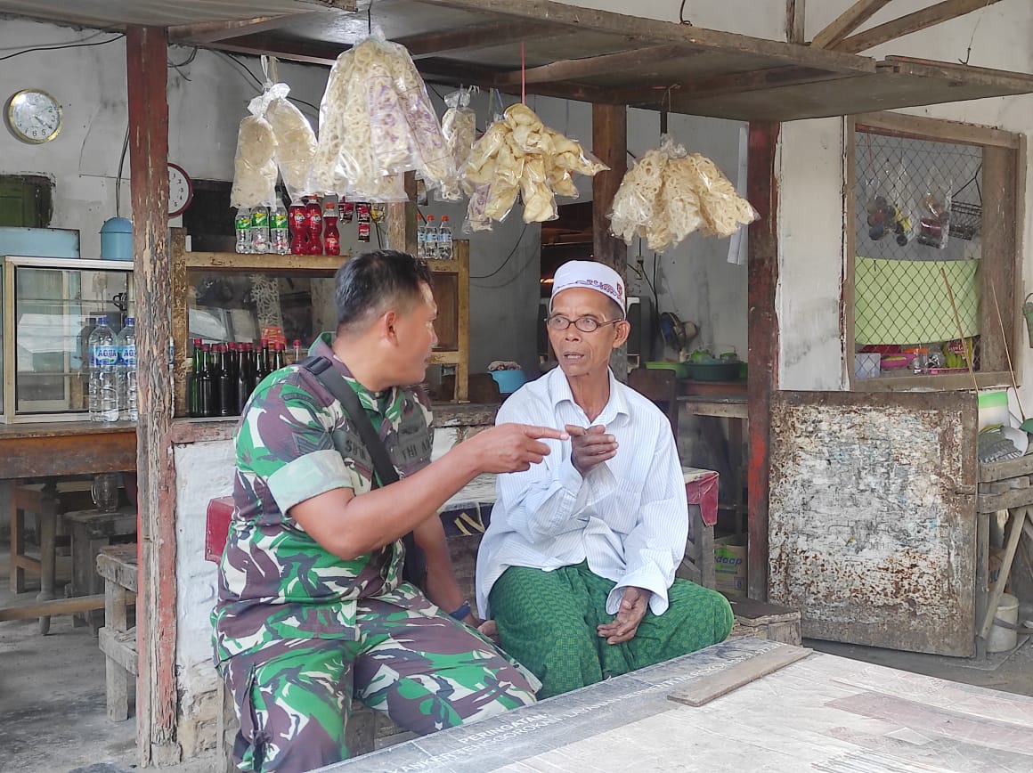 PENJURU.ID | Probolinggo – Sela – sela kegiatannya dalam program Tentara Manunggal Membangun Desa (TMMD), Anggota Babintal Rem 083 Baladhika Jaya Sertu Su’in bersilaturahmi dengan KH. Shon Haji tokoh agama (toga) di Desa Klampok Kecamatan Tongas Kabupaten Probolinggo. Sabtu (30/07/2022) siang.
