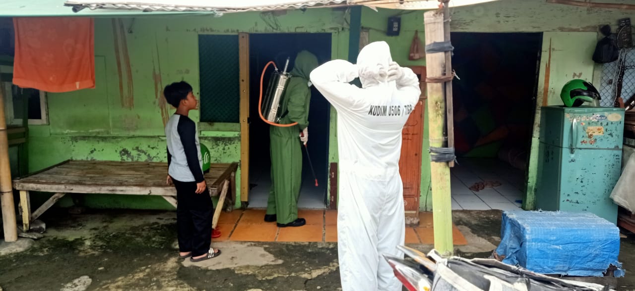 PENJURU.ID | Tangerang – Memutus menyebarnya virus Covid-19 anggota Koramil 01/Tgr Kodim 0506/Tgr melakukan Karya Bakti (Karbak) berupa penyemprotan cairan disinfektan di wilayah Kelurahan Suka’asih Kecamatan Tangerang Kota Tangerang, Senin (26/10/2020).