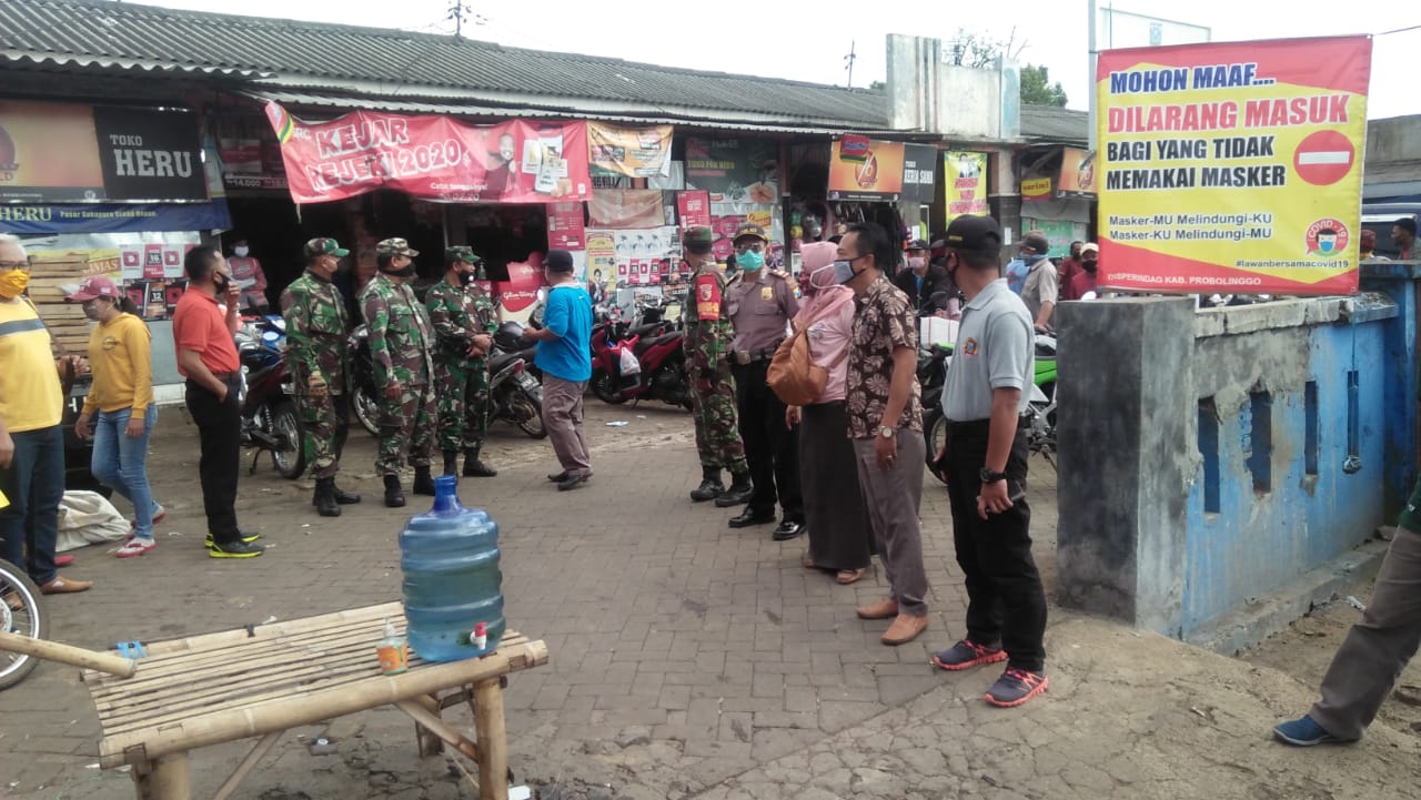 PENJURU.ID | PROBOLINGGO – Sadar dengan bahaya virus Covid-19 Disperindag, Forkopimda Sukapura, Dinkes, Satuan Polisi Pamong Praja dan Kepala Desa Sukapura melakukan sidak bersama ke pasar Sukapura untuk memberikan edukasi dan himbauan agar masyarakat baik pedagang ataupun pengunjung wajib menggunakan masker.