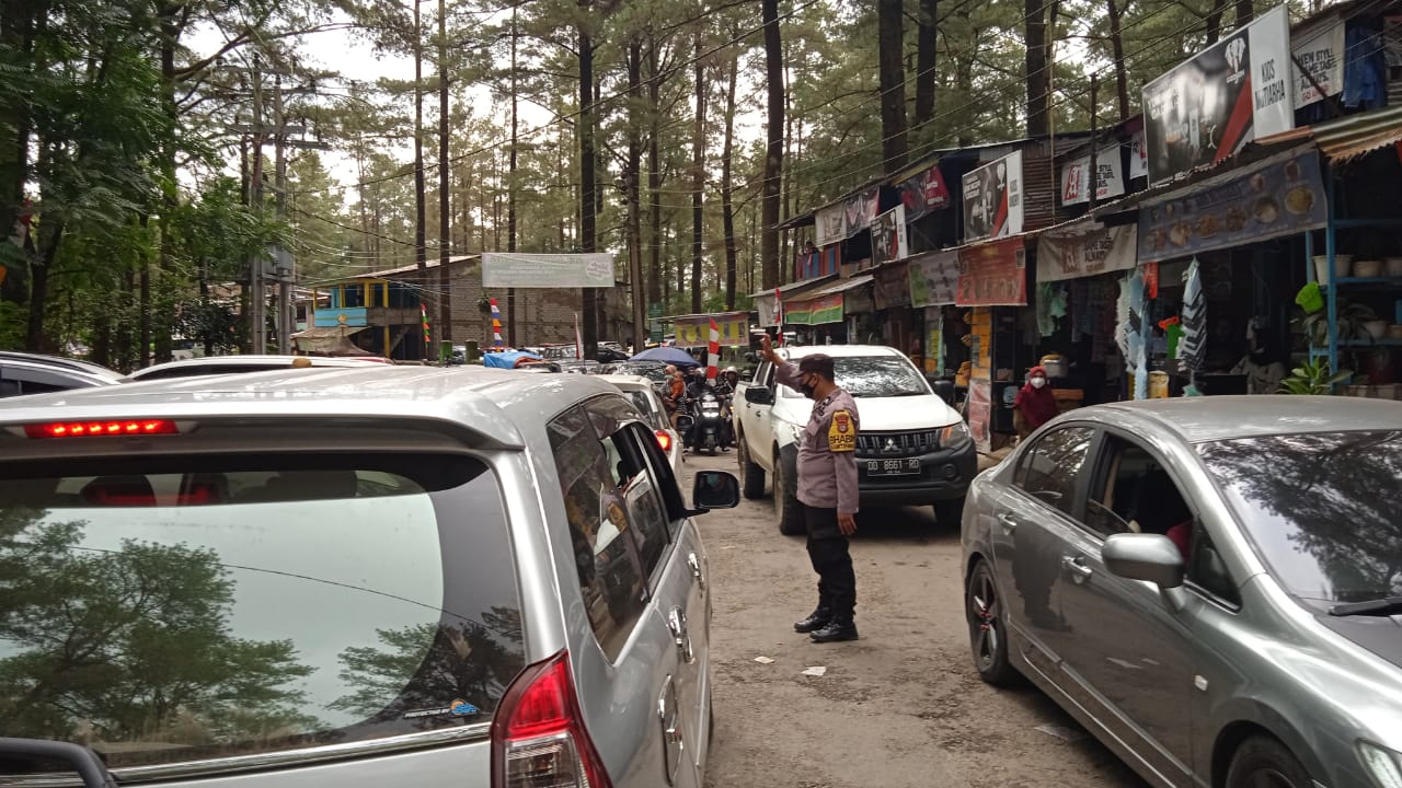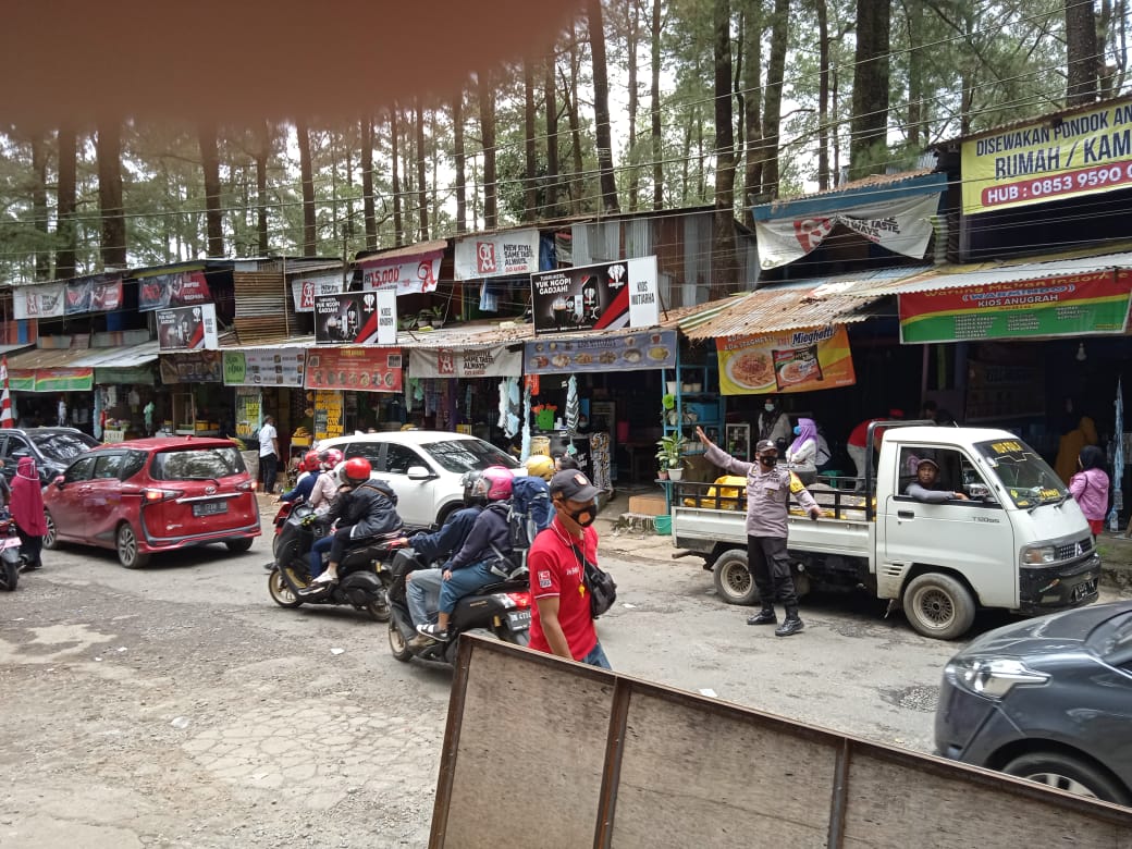 PENJURU.ID | Gowa – Bhabinkamtibmas Malino Polsek Tinggimoncong Polres Gowa BRIPTU Usman mengurai arus lalu lintas di depan objek wisata hutan pinus Malino,Minggu (4/7).
