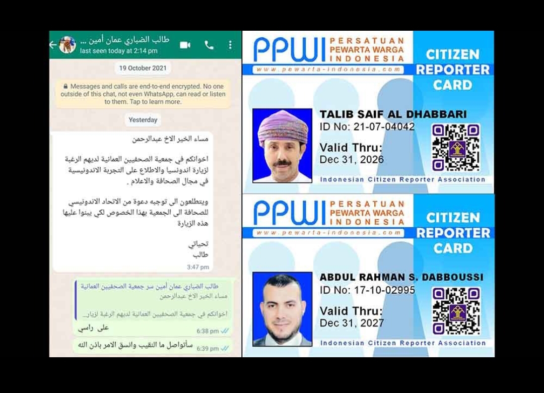 “Saudara-saudara di Persatuan Wartawan Oman berkeinginan untuk berkunjung ke Indonesia dan belajar tentang pengalaman Indonesia di bidang jurnalistik dan media. Mereka sangat mengharapkan undangan dari Persatuan Pewarta Warga Indonesia kepada asosiasi ini untuk dapat merealisasikan rencana kunjungan tersebut.” Demikian pesan WhatsApp dari Kepala Perwakilan PPWI Oman yang diterjemahkan dari Bahasa Arab ke Bahasa Indonesia oleh Dr. Abdul Raham Salem Dabboussi.