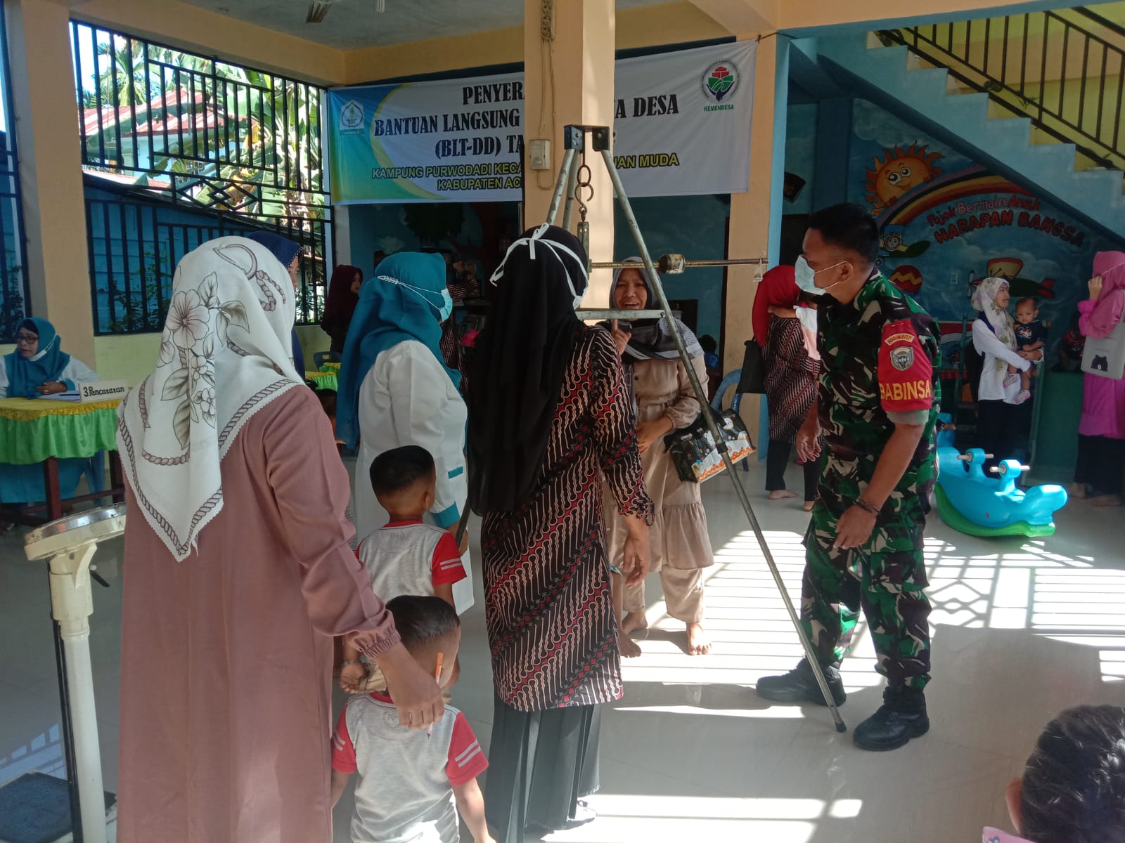 PENJURU.ID | Aceh Tamiang – Babinsa Koramil 07/Kejuruan Muda Kodim 0117/Aceh Tamiang Serda Lo Situmorang melakukan pendampingan Pos Pelayanan Terpadu (Posyandu).Kegiatan Posyandu rutin dilaksanakan guna pengecekan kesehatan para Ibu, Bayi dan anak-anak bertempat di kantor Datok Desa Purwodadi, Kecamatan Kejuruan Muda, Kabupaten Aceh Tamiang. Rabu (09/03/2022).