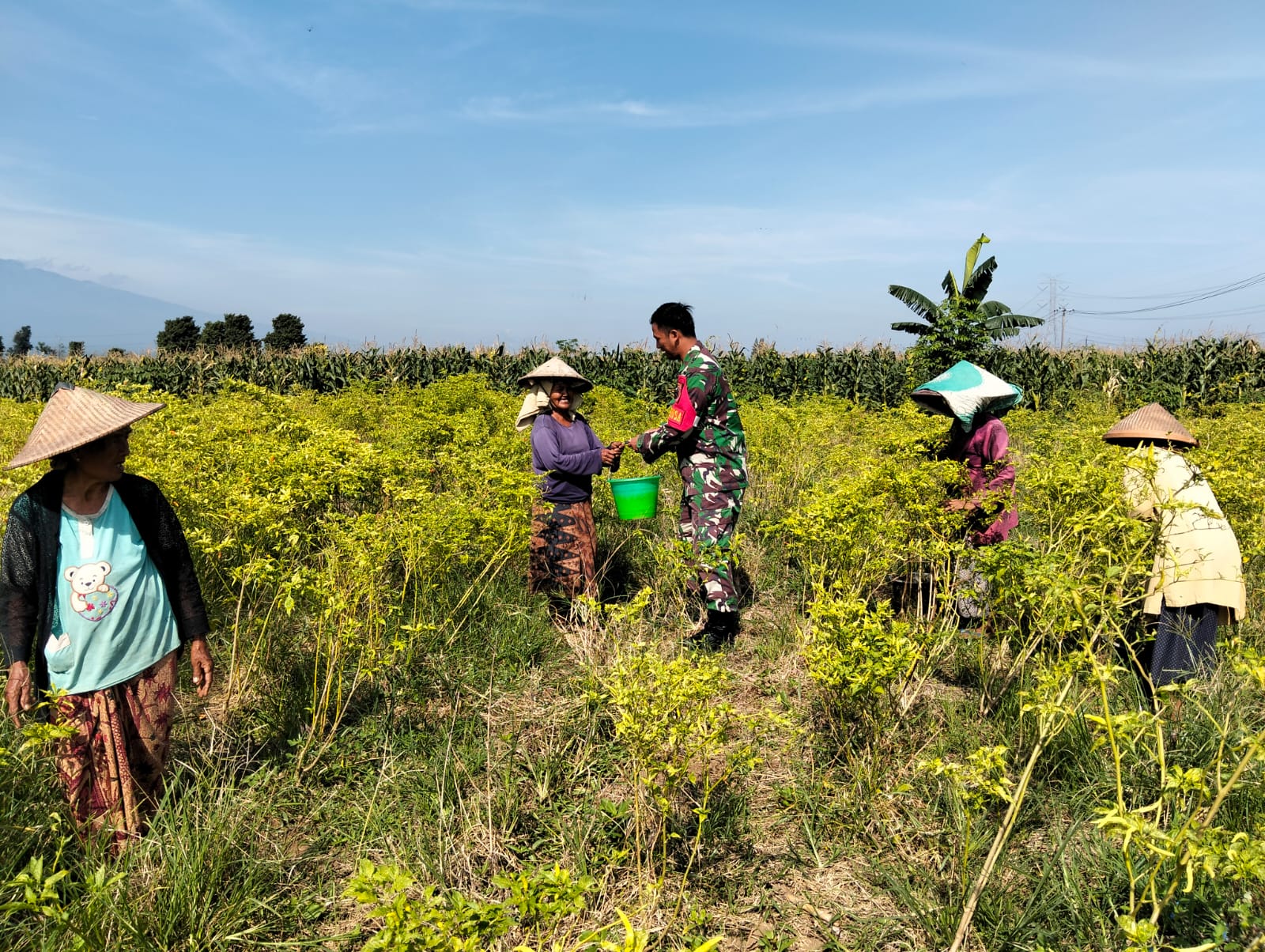 Anggota Koramil Wonomerto, Serka Erfan, bersama warga melaksanakan kegiatan membantu panen cabai milik salah satu warga binaan, Sabtu (20/12/2025).