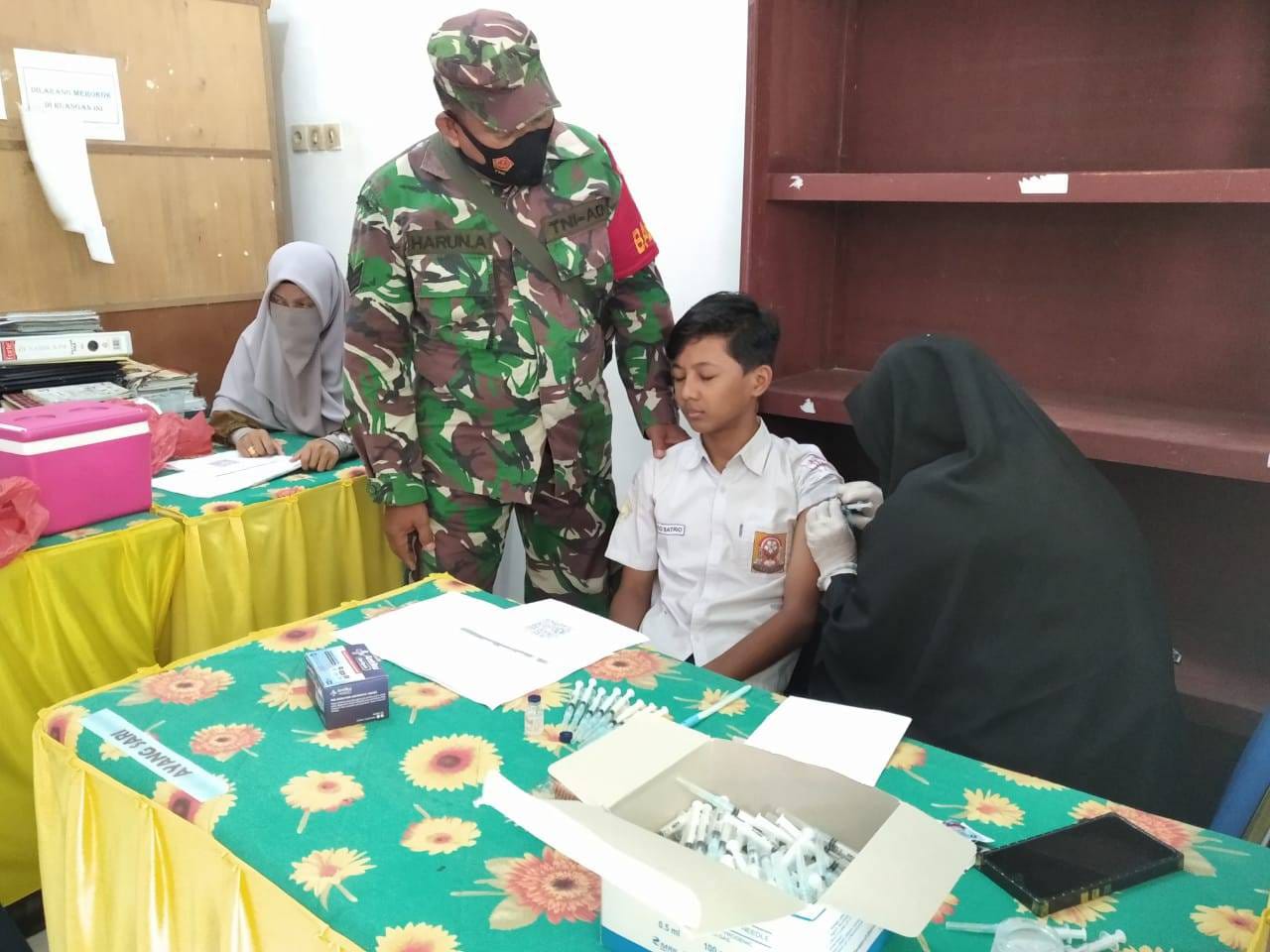 PENJURU.ID | Aceh Tamiang – Untuk kelancaran, keamanan maupun ketertiban pelaksanaan kegiatan Vaksinasi Tahap I dan II, Babinsa Posramil Tenggulun jajaran Kodim 0117/Aceh Tamiang Serka Harun bersama Bhabinkamtibmas melaksanakan pengamanan saat proses injeksi vaksin kepada Pelajar yang di selenggarakan oleh Tim Medis (Puskesmas) Tenggulun. Bertempat di Kecamatan Tenggulun, Kabupaten Aceh Tamiang. Rabu (03/11/2021).