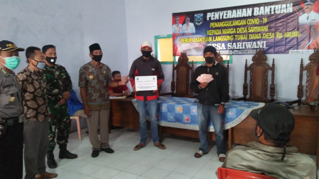 Hingga hari ini sabtu 6/06/2020 bantuan langsung tunai dana desa BLT-DD dibagikan di Desa Sariwani Kecamatan Sukapura kabupaten Probolinggo kades Sariwani Sukaryo BS di hadapan media PENJURU.ID mengatakan semua warga yang dapat bantuan uda di seleksi serta tetap mematuhi protokol kesehatan penerima bantuan tetap harus pakai masker cuci tangan serta jaga jarak Sukaryo B.S berpesan pada warga yang menerima bantuan agar mengunakan dana BLT-DD senilai RP. 600.000 untuk membeli sembako karena tujuan pemerintah membantu untuk ketahanan pangan.