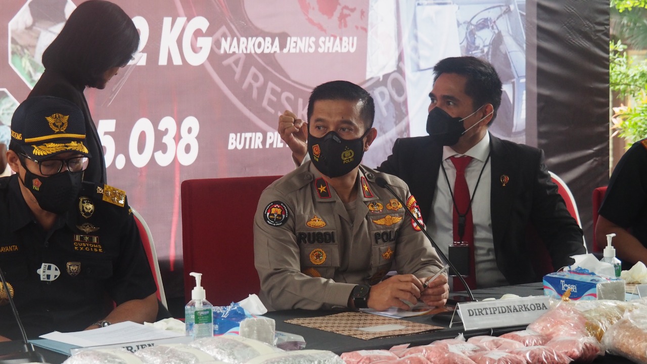 “Kami sampaikan sejak tanggal Februaei sampai hari ini Dit tipid narkoba Bareskrim bersama Ditjen Bea Cukai khususnya Sub Firektorat Narkotika melakukan operasi gabungan diberi sandi Dewa Ruci 2021,” kata Dir Tipid Narkoba Bareskrim Polri Brigjen Krisno Halomoan Siregar dalam jumpa pers di Gedung Bareskrim Polri, Jakarta Selatan, Selasa (30/3/2021).