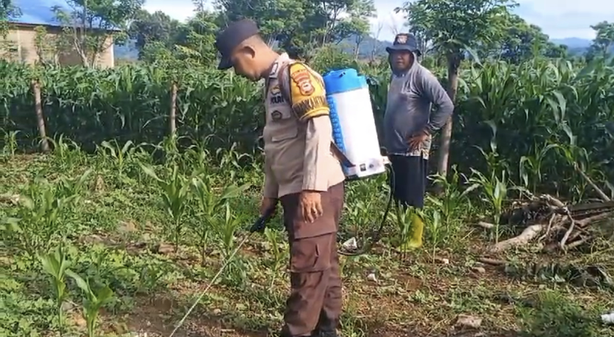 Melihat aktivitas warga, Bripka Ahmadi turut serta membantu dengan menyemprot gulma di sekitar tanaman jagung. Kehadirannya di tengah masyarakat tidak hanya memberikan bantuan fisik, tetapi juga menjadi wujud nyata dukungan moral kepada para petani.