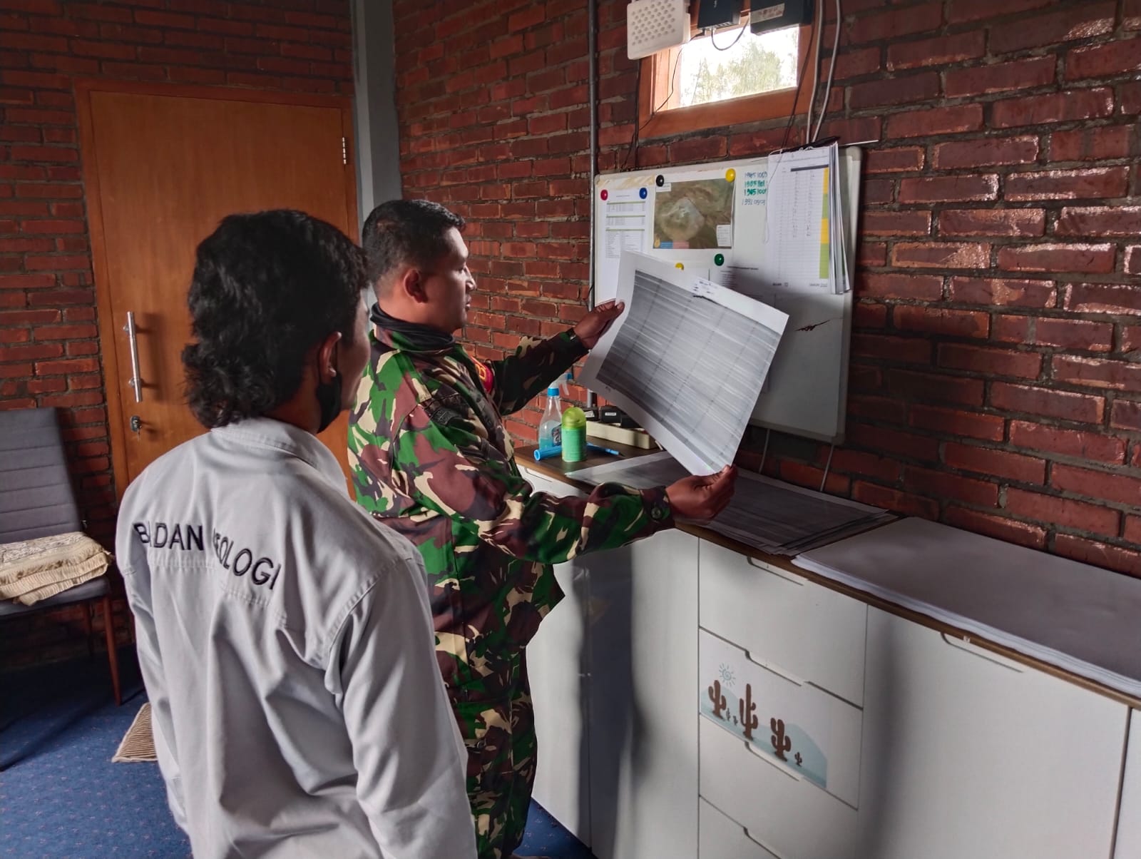 PENJURU.ID | Probolinggo – Koramil 0820/08 Sukapura melakukan pemantuan terkait kondisi aktifitas Gunung Bromo di Pos Pantau Pusat Vulkanologi dan Mitigasi Bencana Geologi (PVMBG) Gunung Bromo di Desa Ngadisari, Kecamatan Sukapura, Kabupaten Probolinggo, Minggu (24/3).