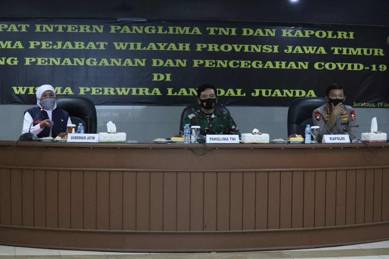 Sementara Panglima TNI menyampaikan bahwa Jawa Timur khususnya Surabaya harus serius dalam menangani tantangan Pandemi Covid-19, Perlunya sosialisasi yang masif terhadap masyarakat terkait disiplin protokol kesehatan.