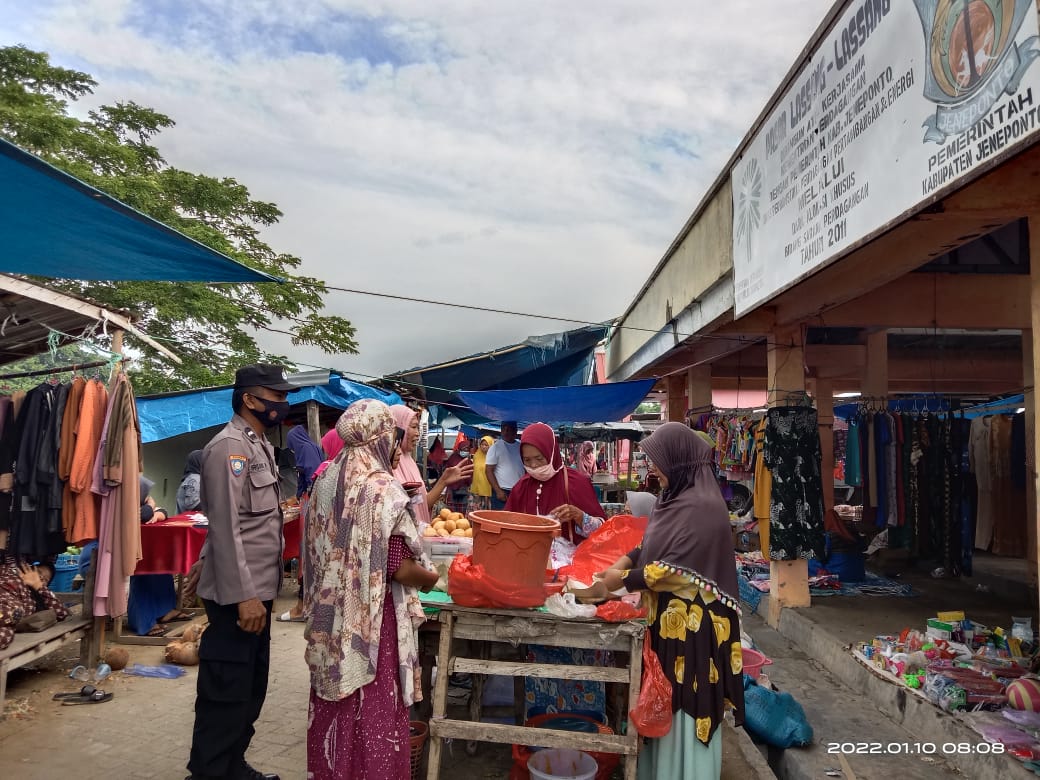 PENJURU. ID | Jeneponto – Bhabinkamtibmas Desa Arungkeke Aipda Irsan Nusu melaksanakan giat patroli dan sambang ke pasar tradisional Lassang-lassang, Senin (10/1/2022)