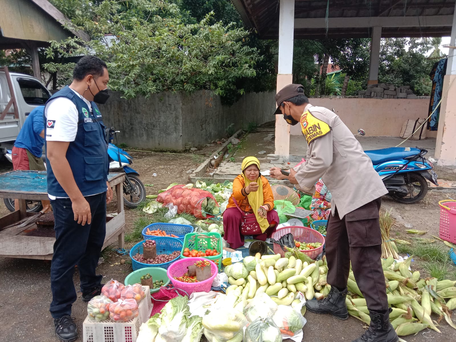 Hadir pula Bhabinkamtibmas Bripka Ichsan Syam berikan himbauan kepada pengunjung dan pedagang pasar tentang penggunaan masker serta vaksinasi, Sabtu (25/12/2021)