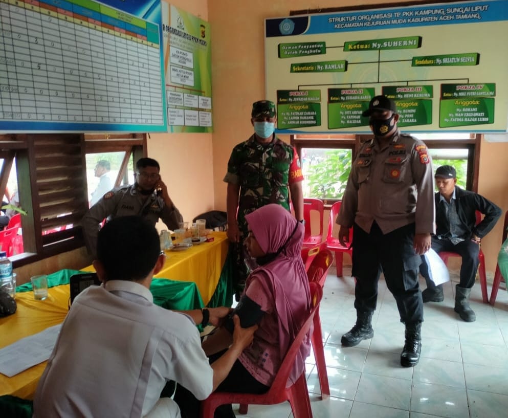PENJURU.ID | Aceh Tamiang – Bersinergritas dalam melakukan pelayanan terhadap masyarakat hal ini di tunjukan oleh Babinsa Desa Sungai Liput Koramil Kejutan Muda Sertu Wahyudi bersama Bhabinkamtibmas dengan mendampingi Pelaksanaan vaksinasi Covid 19 warga Desa Sungai Liput, Kecamatan Kejuruan Muda, Kabupaten Aceh Tamiang. Senin (21/03/2022).