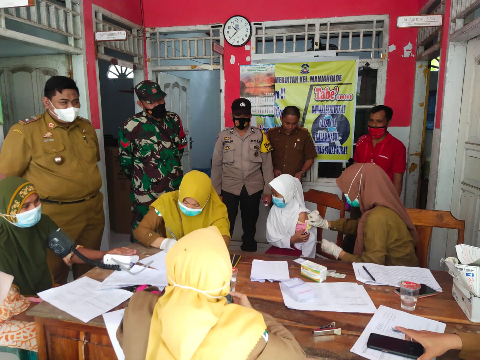 PENJURU. ID | Jeneponto – Bhabinkamtibmas Aiptu Suwadi bersama Babinsa Koptu Zainuddin melakukan pemantauan kegiatan vaksinasi covid-19 yang berlangsung di Kantor Kelurahan Manjangloe Kecamatan Tamalatea, Senin (07/03/2022)