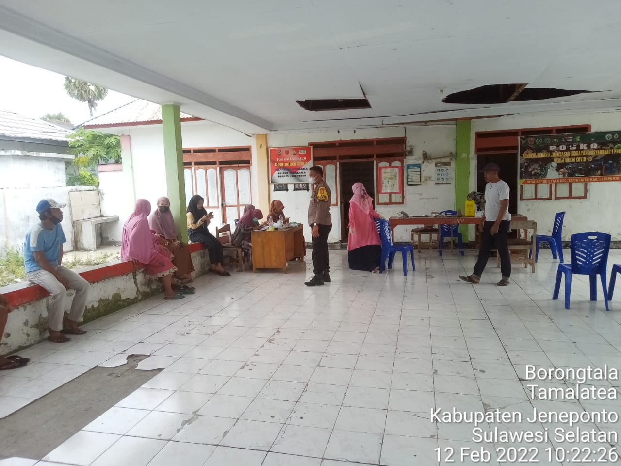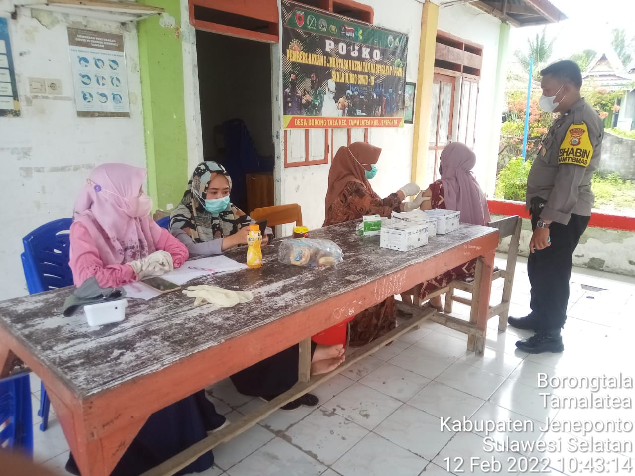 PENJURU. ID | Jeneponto – Personel Polsek Tamalatea Aiptu Abd Rahim melaksanakan kegiatan pengamanan dan monitoring kegiatan vaksinasi covid-19 bertempat di Desa Borontala Kecamatan Tamalatea, Sabtu (12/02/2022)