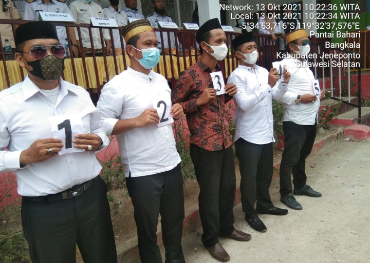 PENJURU. ID | Jeneponto – Bhabinkamtibmas Desa Garassikan Polsek Bangkala Polres Jeneponto, Aipda Rustan melaksanakan pemantauaan kegiataan tahapaan Pencabutan nomor oleh Panitia Pilkades Desa Garassikang Kecamatan Bangkala, Rabu (13/10/2021).