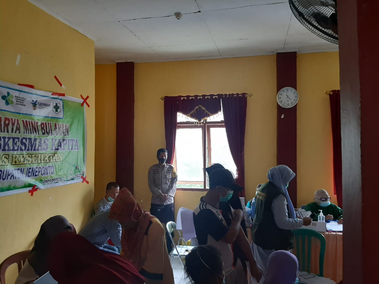 PENJURU. ID | Jeneponto – Bahabinkamtibmas Polsek Bangkala Polres Jeneponto, Aipda A, Haris SH melakukan giat sambang dengan memantau pelaksanaan Vaksinasi di Aula Puskesmas Desa Kapita, Kecamatan Bangkala, Kabupaten Jeneponto, Jumat (09/07/2021) sekitar Pukul 10.00 wita s/d selesai.