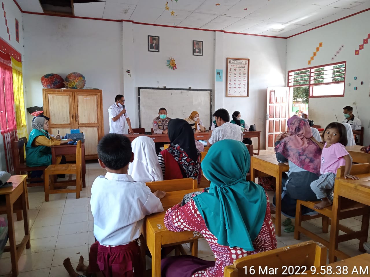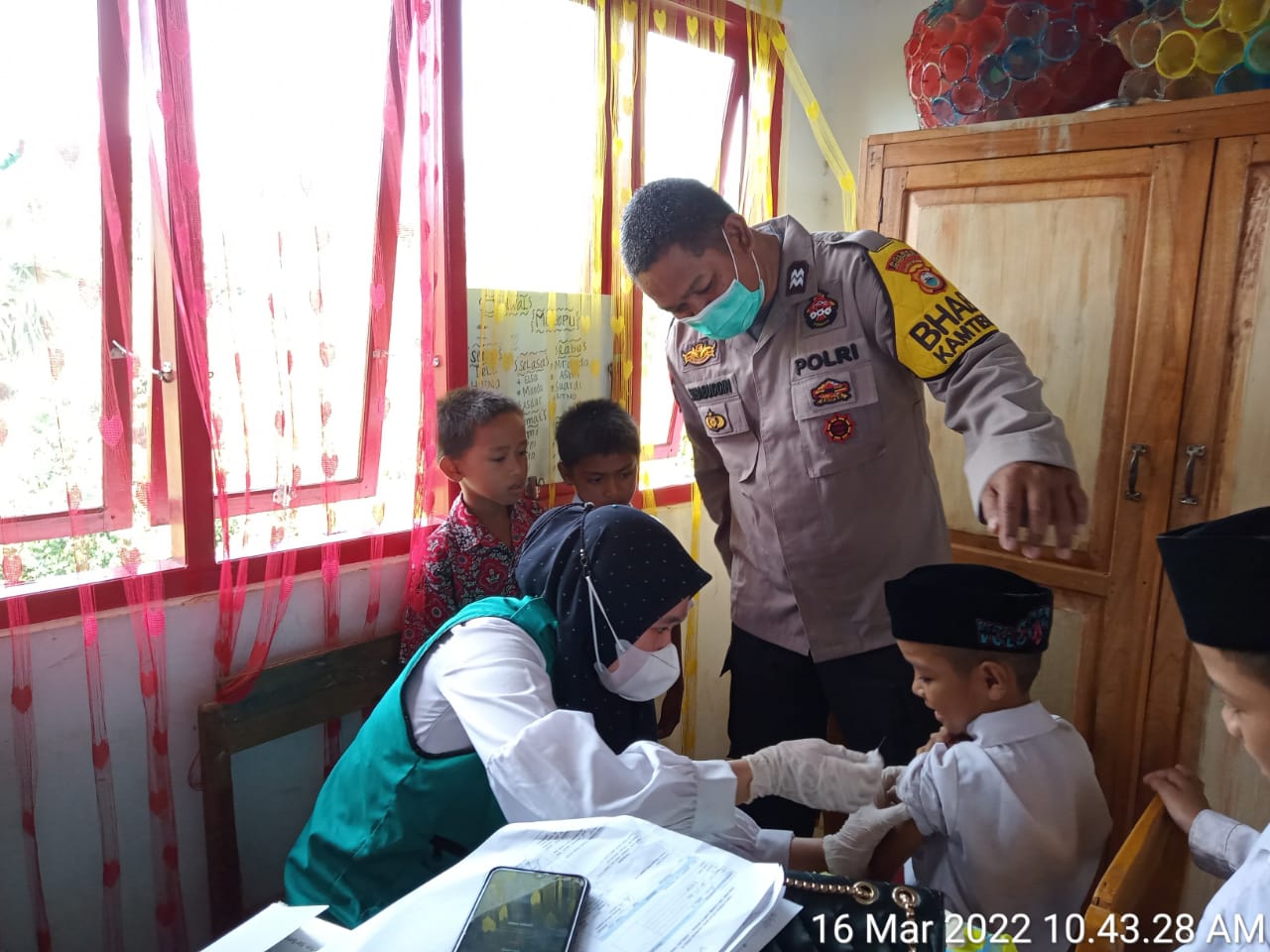 Bhabinkamtibmas Aiptu Sahabuddin melaksanakan sambang diwilayah binaan dan mengikuti sosialisasi dan pemberian vaksin bagi anak usia 6-11 tahun juga bagi warga yang berada dan bermukim di sekitar sekolah.