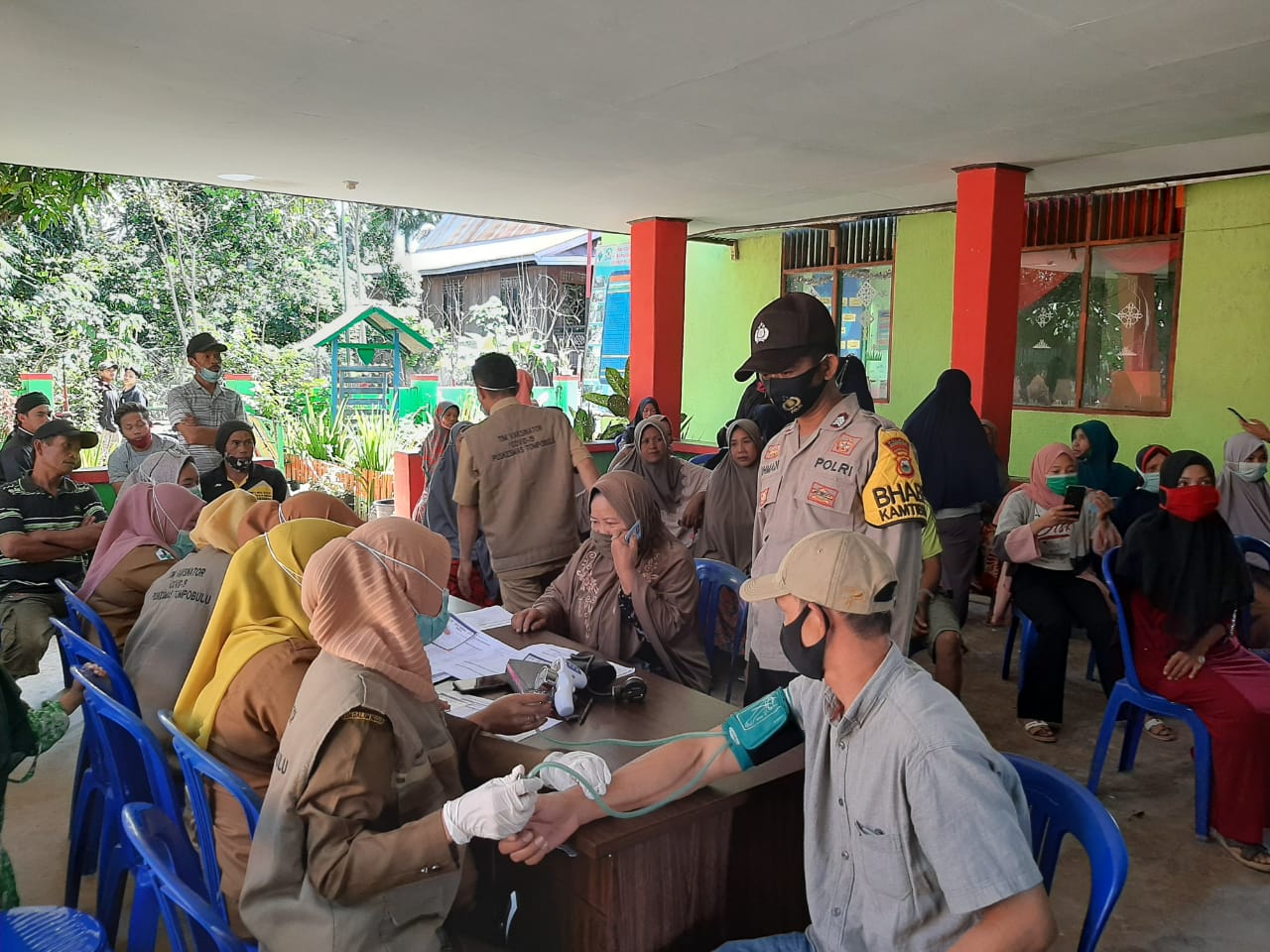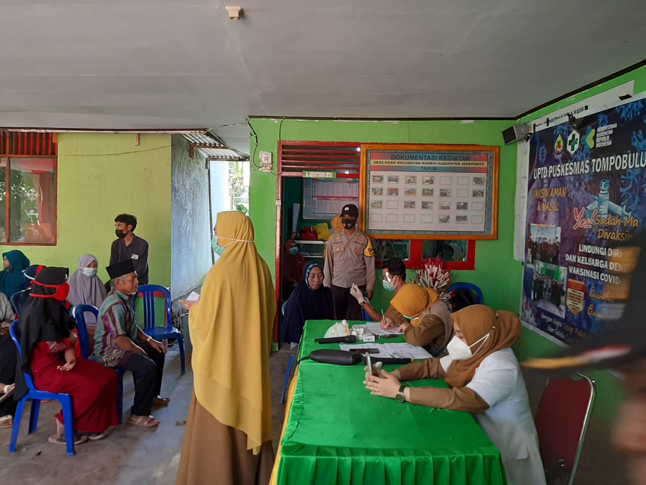PENJURU. ID | Jeneponto – Bhabinkamtibmas Desa Kassi Polsek Kelara Polres Jeneponto, Brigpol Ahmadi melaksanakan pemantauan pada kegiatan Vaksin di Wilayah Binaanya.