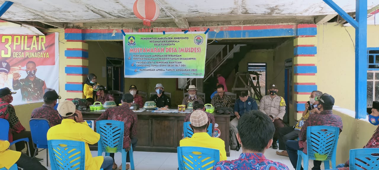 PENJURU.ID | Jeneponto – Bhabinkamtibmas Desa Mallasoro Polsek Bangkala Aiptu Dri Satoto Hartono bersama Babinsa Sertu Misbahuddi mengikuti Rapat Musyawarah Desa (MUSDES) Desa Punagaya yang di buka Kepala Desa Punagaya Andi Pangerang Musramu S.Sos yang berlangsung dilaksanakan Kantor Desa Punagaya, Kecamatan Bangkala, Kabupaten Jeneponto, Kamis (11/02/2021) sekitar pukul 10.20 wita.