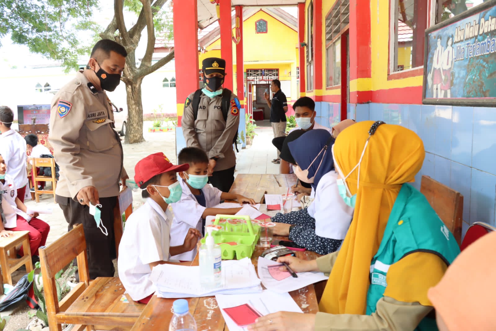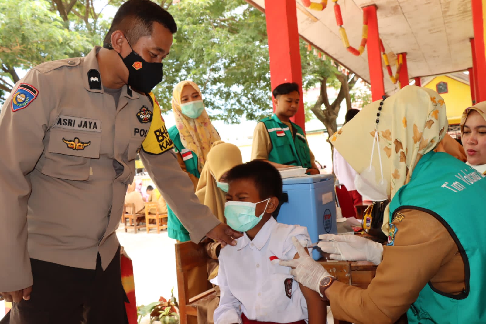 “Vaksin yang akan diberikan kepada anak-anak sudah di uji klinis serta aman dan halal untuk digunakan.” jelas Aipda Asri Jaya