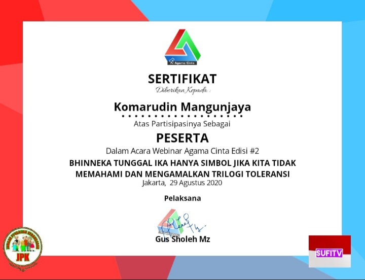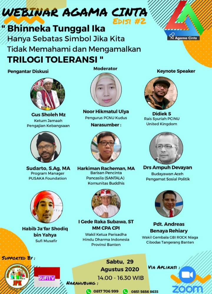 PENJURU.ID | Banten – Webinar Kebangsaan Agama Cinta, edisi kedua bertemakan: “BHINNEKA TUNGGAL IKA Hanya Sebatas Simbol Apabila Kita Tidak Memahami dan Mengamalkan TRILOGI TOLERANSI”, dilaksanakan pada hari Sabtu, 29 Agust 2020, pukul 13.45 berakhir 17.15 WIB, menggunakan aplikasi Meeting Virtual Zoom.