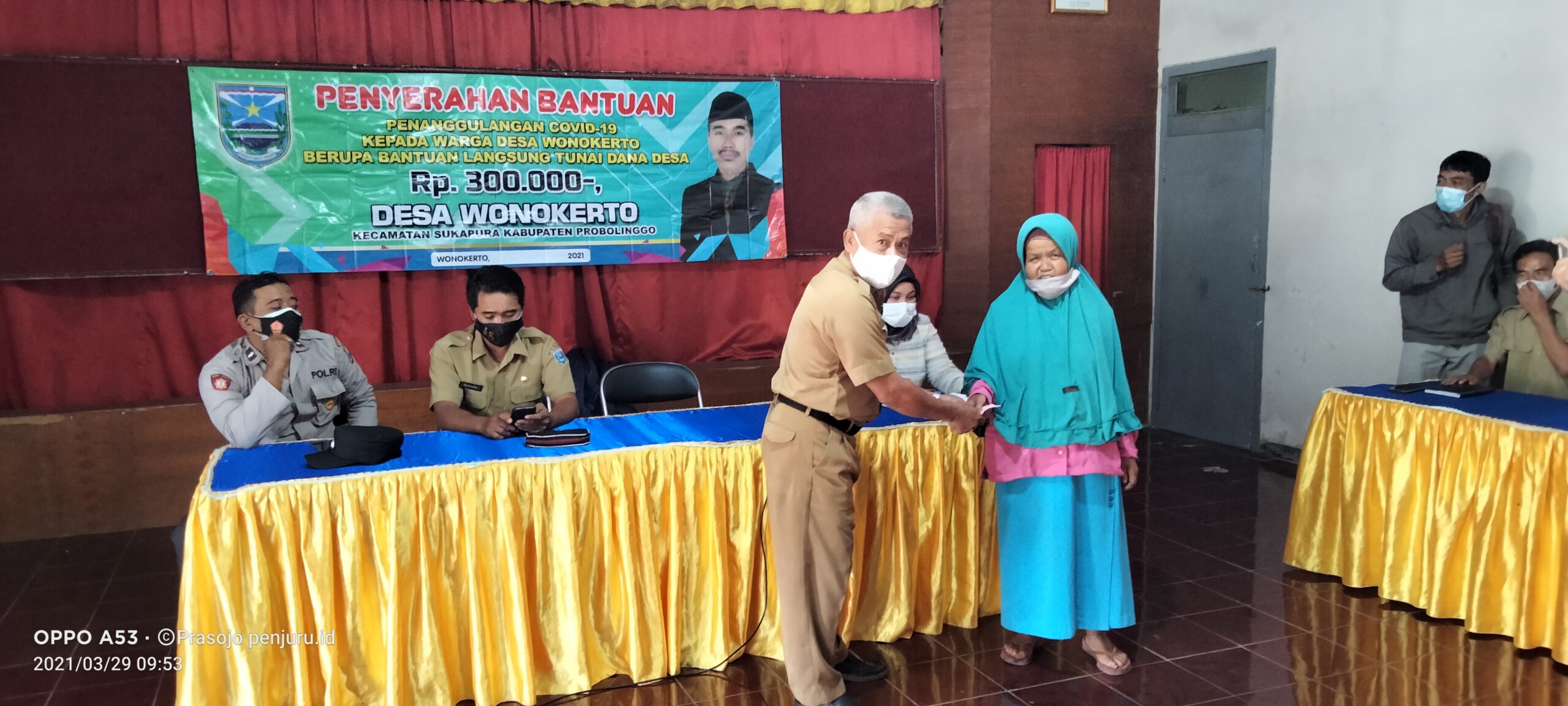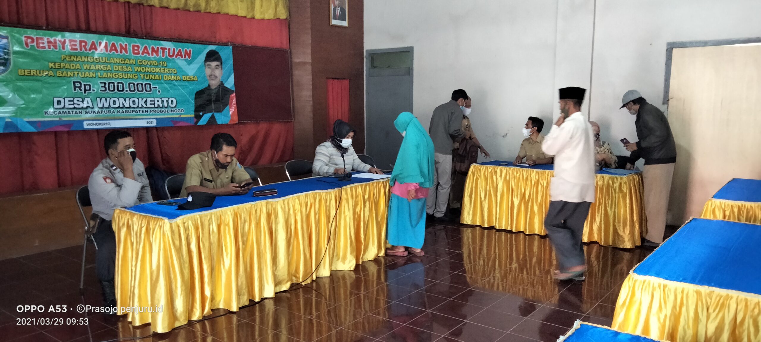 Turut serta dalam kegiatan pembagian BLT DD tahap 1 Desa Wonokerto, Kecamatan Sukapura, Babinkamtibmas Desa Wonokerto, Perangkat Desa Wonokerto, pendamping Desa.