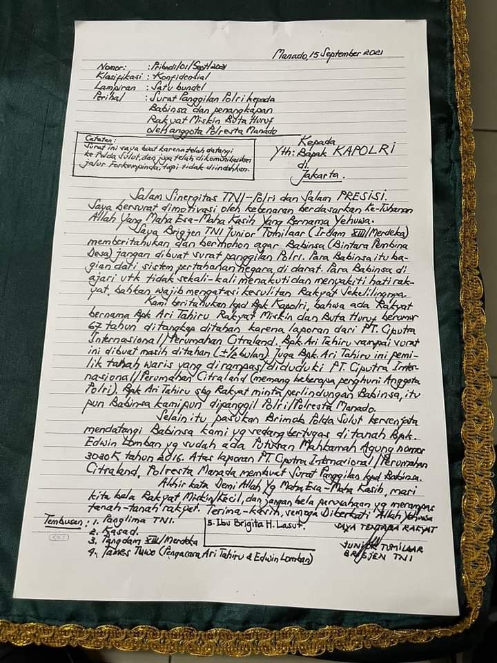Junior tidak terima ketika sang Babinsa membela rakyat kecil, berkonsekuensi harus dipanggil Polresta Manado, dan Ari yang merupakan warga buta huruf harus ditangkap aparat. Dia pun menulis surat di Kota Manado pada 15 September 2021, yang ditujukan kepada orang nomor satu di organisasi Polri.