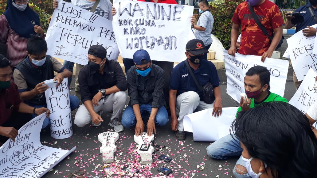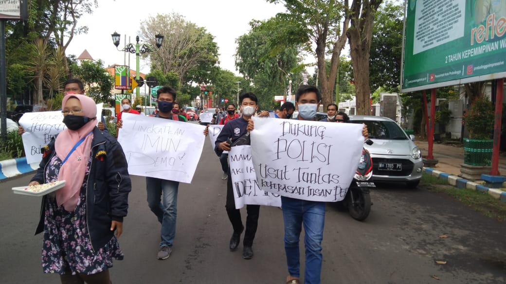 PENJURU.ID | Probolinggo – Puluhan Jurnalis Probolinggo Demo Komite Aksi Perlawanan Pers, Atas Arogansi oknum Aparat, gabungan para Jurnalis Probolinggo Raya menuntut adanya penegakkan hukum atas kekerasan fisik yang dilakukan oknum aparat Kepolisian, kepada Nurhadi, Jurnalis Tempo saat menjalankan tugas jurnalistik, Aksi damai ini dilakukan di jalan Panglima Sudirman Kota Probolinggo. Selasa (30/03/2021)