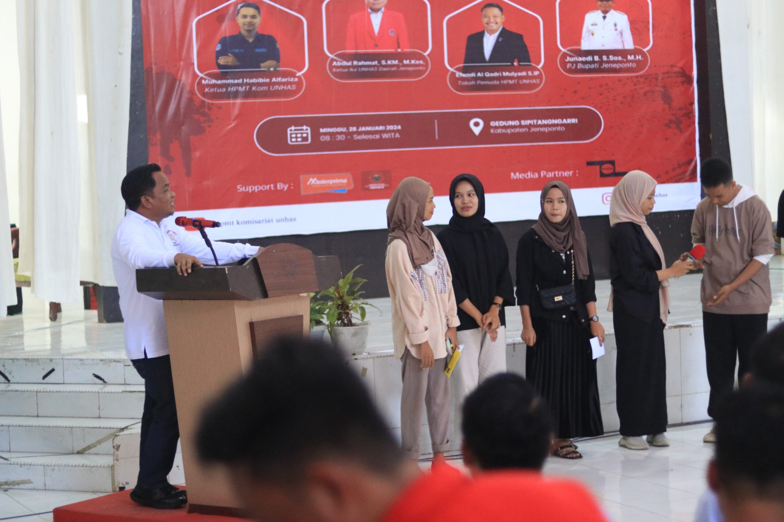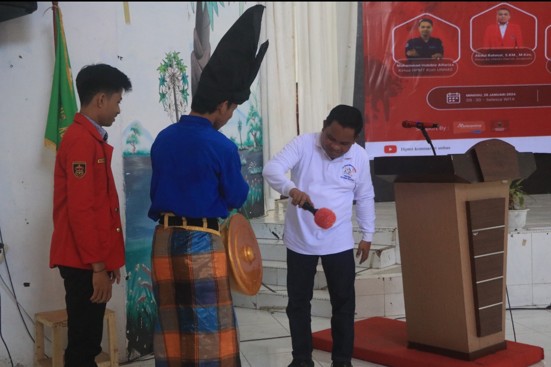 PENJURU. ID | Jeneponto – Bupati Jeneponto, Junaedi Bakri, hadiri acara pembukaan Try Out dan Talk Show yang diselenggarakan oleh Himpunan Mahasiswa Pemuda Turatea (HPMT) Komisariat Universitas Hasanuddin Makassar, ahad (28/01/2024).