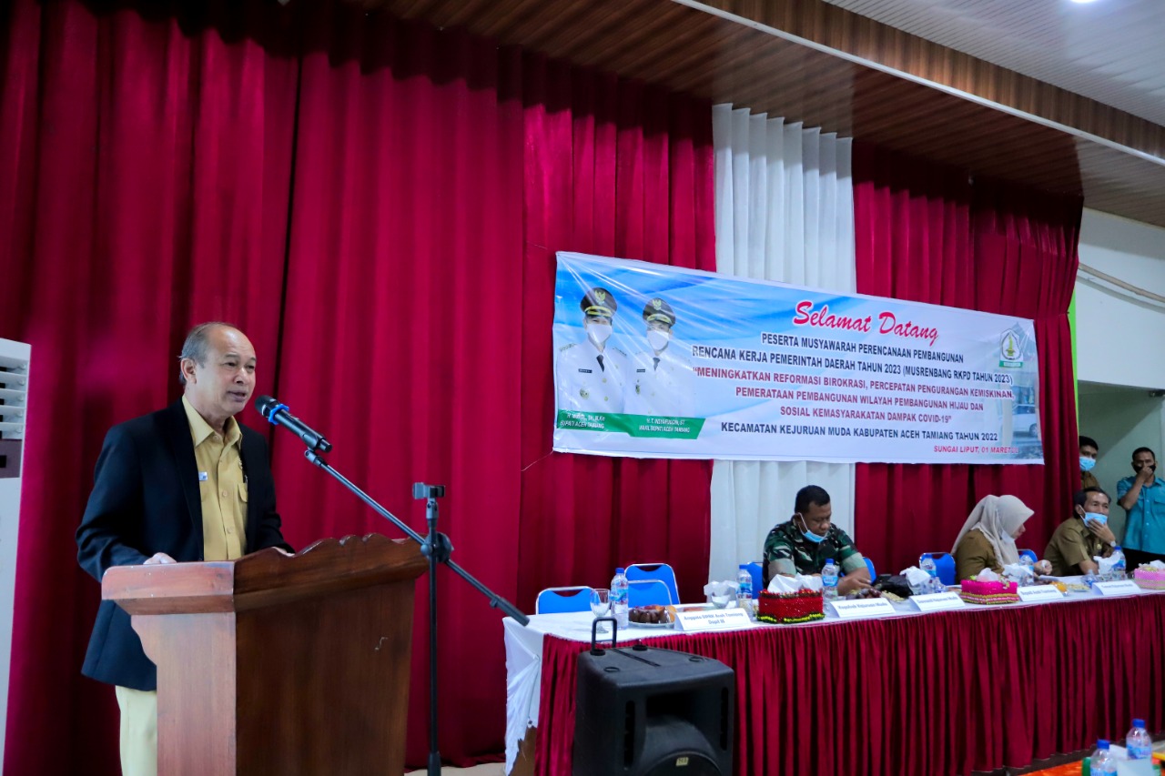 Sebelumnya, Camat Kejuruan Muda Rusni Devi melaporkan bahwa sebelum melaksanakan kegiatan ini, kegiatan pra Musrenbang telah lebih dahulu dilaksanakan oleh Tim Delegasi Kampung bersama Aparatur Kampung pada 24 Februari 2022 di Aula Kantor Camat setempat. Dalam kesempatan itu ia mengungkapkan bahwa Timnya telah menyepakati berbagai kesepakatan dalam berbagai bidang untuk dibahas dalam kegiatan yang berlangsung hari ini.