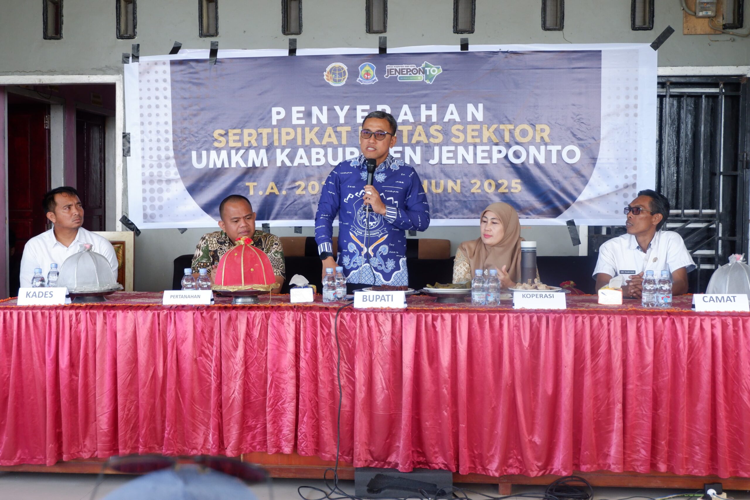 Penyerahan sertifikat dilakukan secara simbolis oleh Bupati Jeneponto, didampingi Kepala Kantor Pertanahan Jeneponto dan Kepala Dinas Koperasi Jeneponto. Kehadiran para pemangku kepentingan ini menegaskan sinergi antara pemerintah dalam mendukung kepastian hukum pertanahan sekaligus pemberdayaan UMKM di tingkat desa.