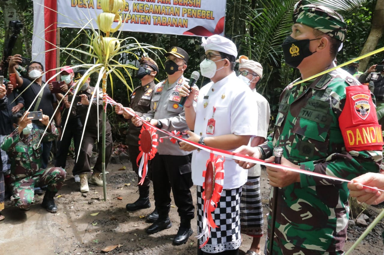 PENJURU.ID|TABANAN– Mengapresiasi sinergi pemerintah dan masyarakat dalam mewujudkan kesejahteraan di Desa Biaung terkait pengembangan fasilitas air bersih, Bupati Tabanan Dr. I Komang Gede Sanjaya S.E., M.M resmikan Pompa Air Hidram yang merupakan program dari Kodam IX/Udayana Tabanan, di Banjar Cacab, Jangkahan, Desa Biaung Kecamatan Penebel, Tabanan, Rabu (20/10) yang ditandai dengan pemotongan pita.