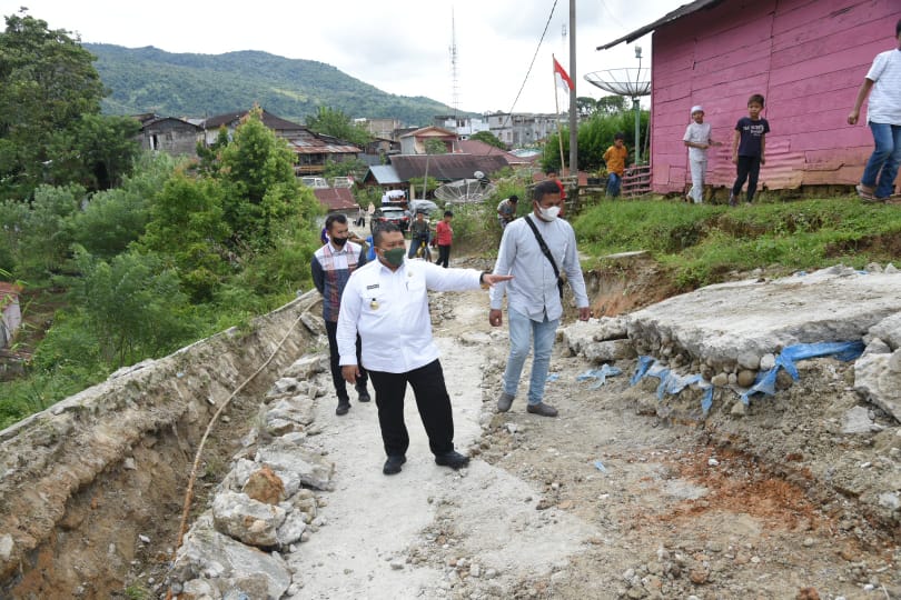PENJURU.ID | TAPSEL-Setelah mendengar jalan rabat beton yang ambruk, Bupati Tapanuli Selatan (Tapsel), H. Dolly Pasaribu, S.Pt, MM, didampingi Kabag Humas dan Protokol, Isnut Siregar, meninjau langsung ke lokasi kejadian di Lingkungan II, Kelurahan Pasar Sipirok, Kecamatan Sipirok, Kabupaten Tapsel, Jumat (20/8).