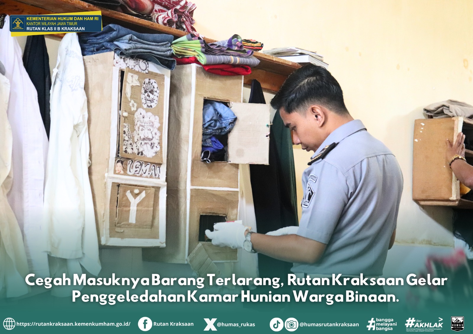 PENJURU.ID | Probolinggo – Rumah Tahanan Negara Kelas IIB Kraksaan Kanwil Kemenkumham Jatim melakukan kegiatan penggeledahan rutin kamar hunian warga binaan oleh Kepala Kesatuan Pengamanan beserta pejabat struktural dan jajarannya.