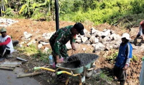 PENJURU.ID I Boyolali – Untuk mencegah terjadinya longsor, Babinsa Koramil 13/Nogosari Kodim 0724/Boyolali Serda Supriyadi gotong royong bersama warga melaksanakan karya bakti membangun talud jalan sebagai penahan tanah dan menutup saluran air, yang bertempat di Tagung Desa Rembun Kecamatan Nogosari, Kabupaten Boyolali. Sabtu (13/12/2025).