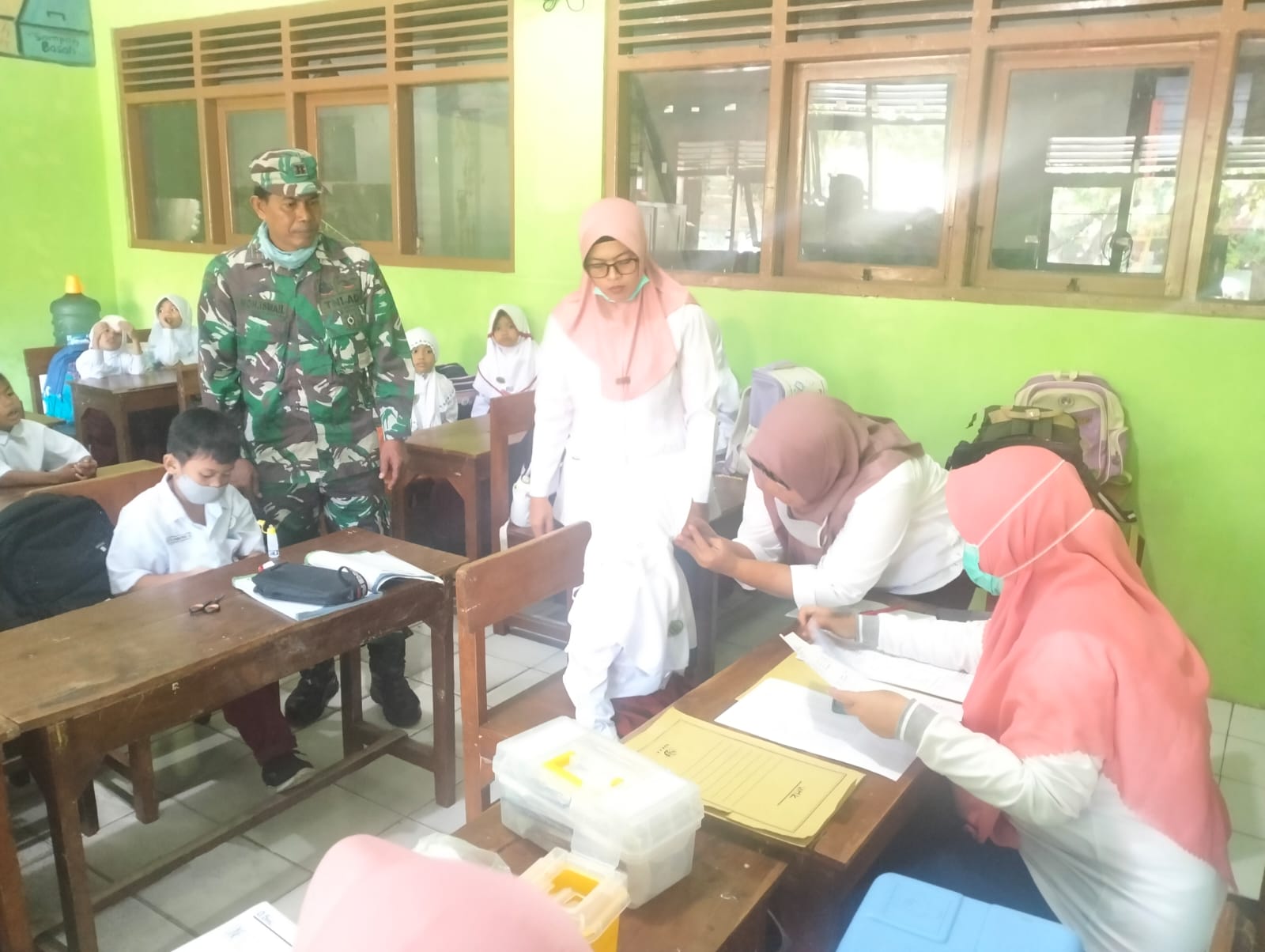 PENJURU.ID | Probolinggo – Anggota Koramil 0820/01 Kanigaran, Peltu Moh Ismail melaksanakan komunikasi sosial dengan mendampingi tim kesehatan melakukan imunisasi kepada para siswa sekolah dasar di wilayah Kelurahan Jati, Kota Probolinggo, Kamis (8/8)