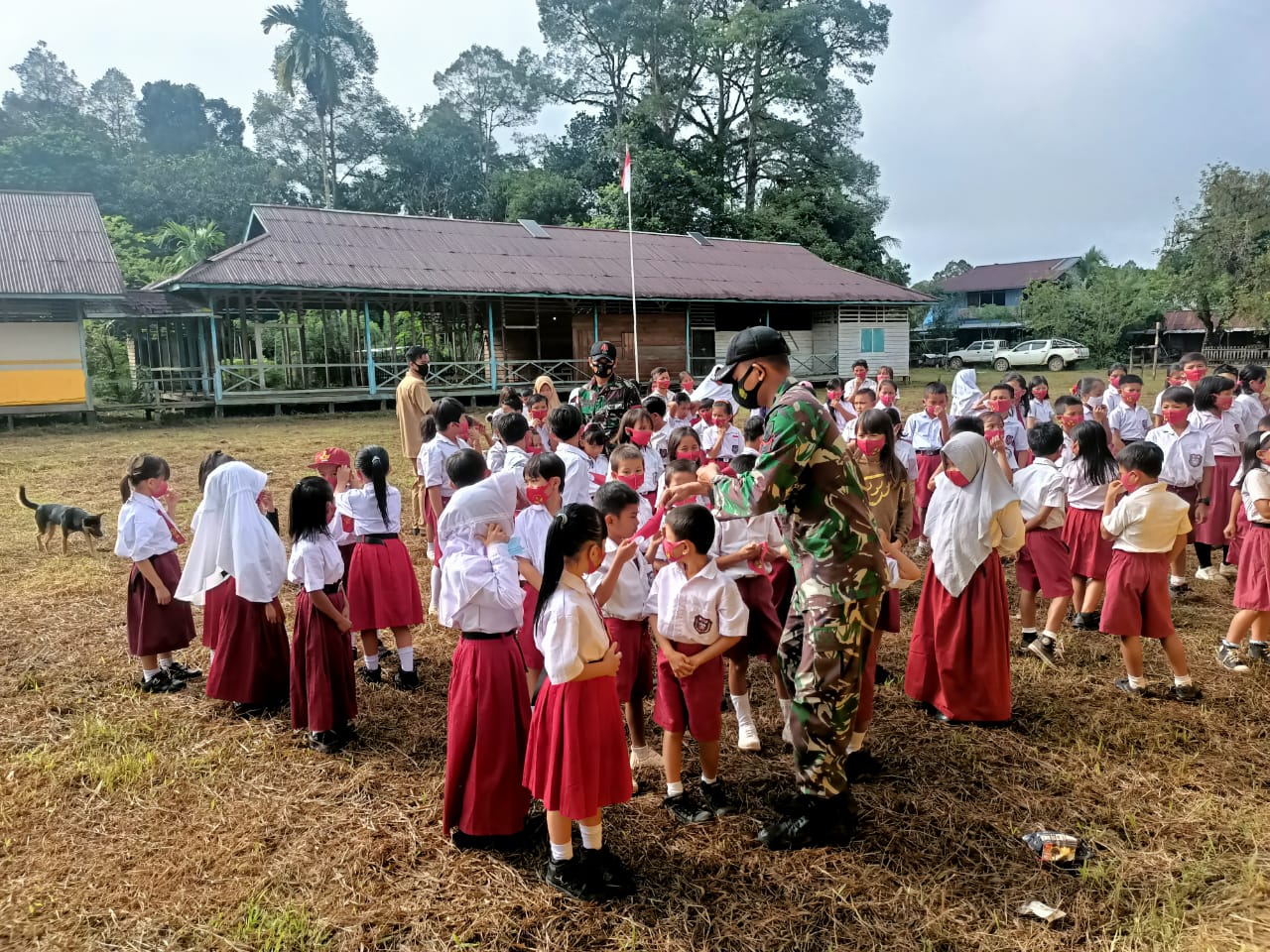 PENJURU.ID | Sintang – Untuk mencegah covid-19 personil Satgas Yonif 144/JY melaksanakan kegiatan mengajak siswa dan siswi SD N 13 memakai masker, jaga jarak serta mencuci tangan dalam proses mengikuti ujian akhir semester didesa Nanga bayan kec. Ketungau hulu kab Sintang Kalbar, Selasa (8/6/2021).